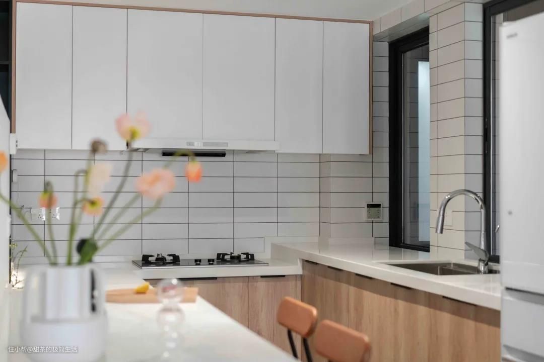 厨房是开放式设计,由原厨房和原餐厅两部分组成,使用空间得到了很大的提升。操作台是L型布局,“洗切炒”动线合理划分;左侧增设了一个小型吧台,搭配两张高脚椅,既能当餐桌来使用,又能作为橱柜操作台面的补充。