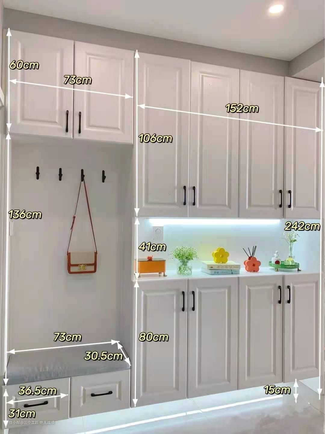 进门的左手边做了顶天立地的玄关鞋柜(详细尺寸见下图),上层放不常穿鞋和储物,下层放常穿鞋,入户处放丝圈地毯,鞋柜做了换鞋区,中间镂空部分的小灯管是插电的,台面放上喵喵爪托盘和收纳盒太好看了~