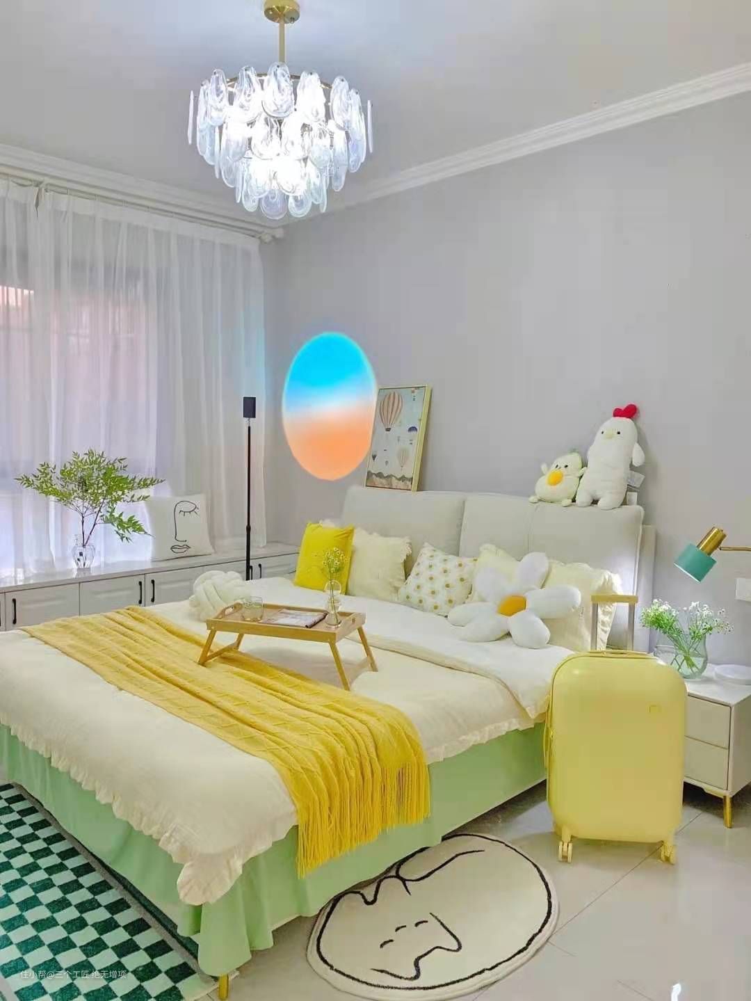 这样的主卧也太清新了吧,一盏破晓灯打在墙上,蓝橘色灯光搭配起来好像一片海洋,房间格外温馨,满满氛围感~