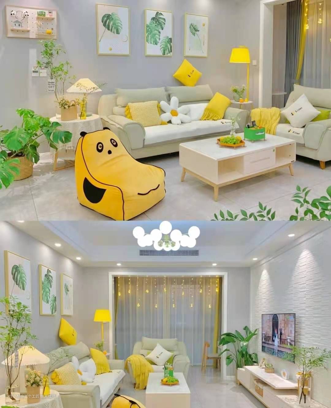 小清新的客厅怎么看都很凉爽每到晚上把窗帘上的星星灯打开,显得客厅温馨又浪漫~给沙发垫上沙发垫,颜色和沙发太般配了