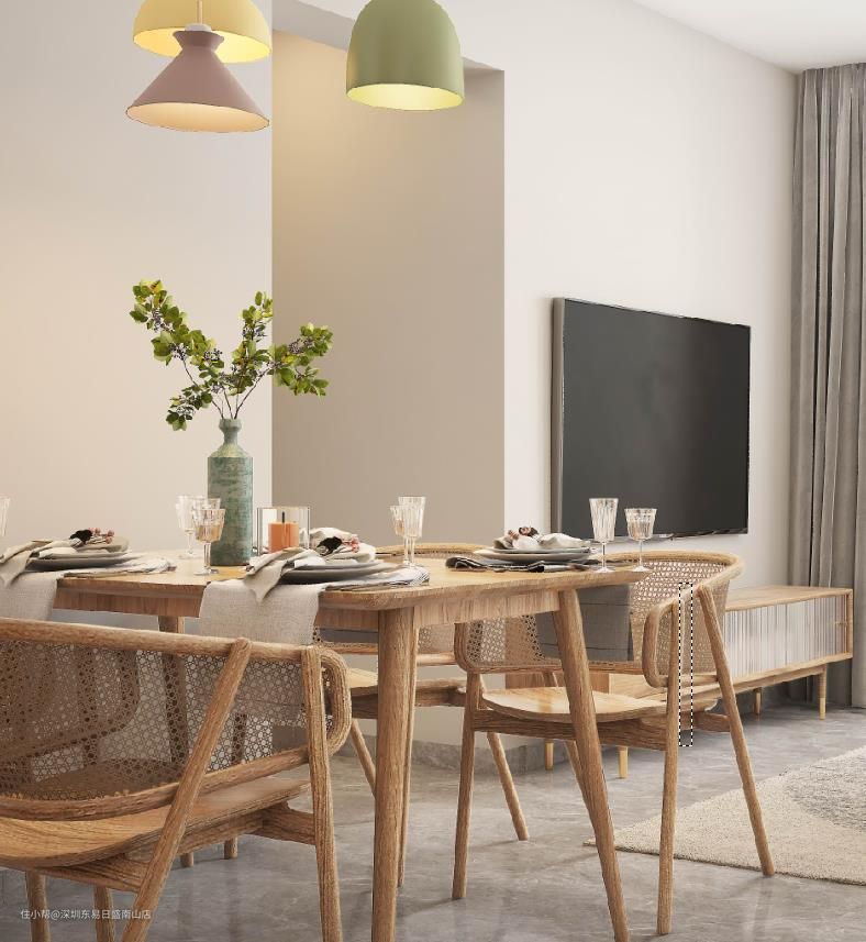 原木风的餐桌,有趣的春色吊灯,桌上的绿植,也充满春意!