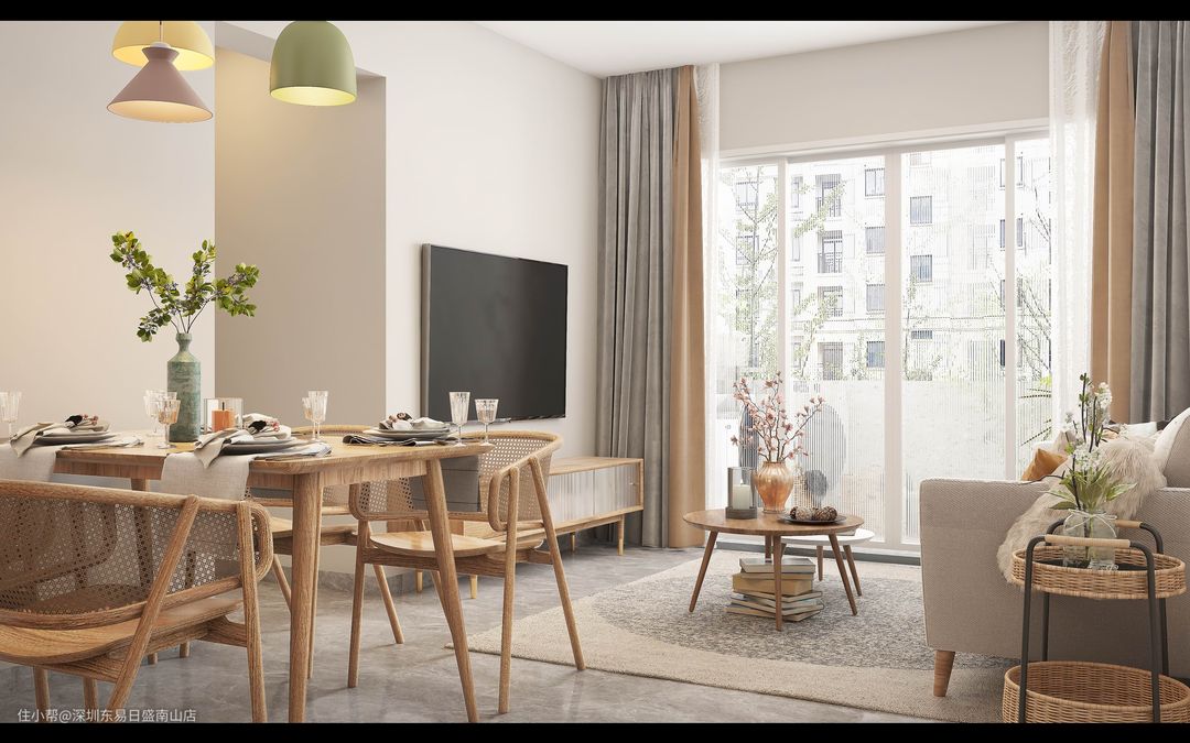 从客厅望去,采光极佳,白色玻璃推拉门隔断,灰调与木色的拼接窗帘,增添了一丝趣味性。
