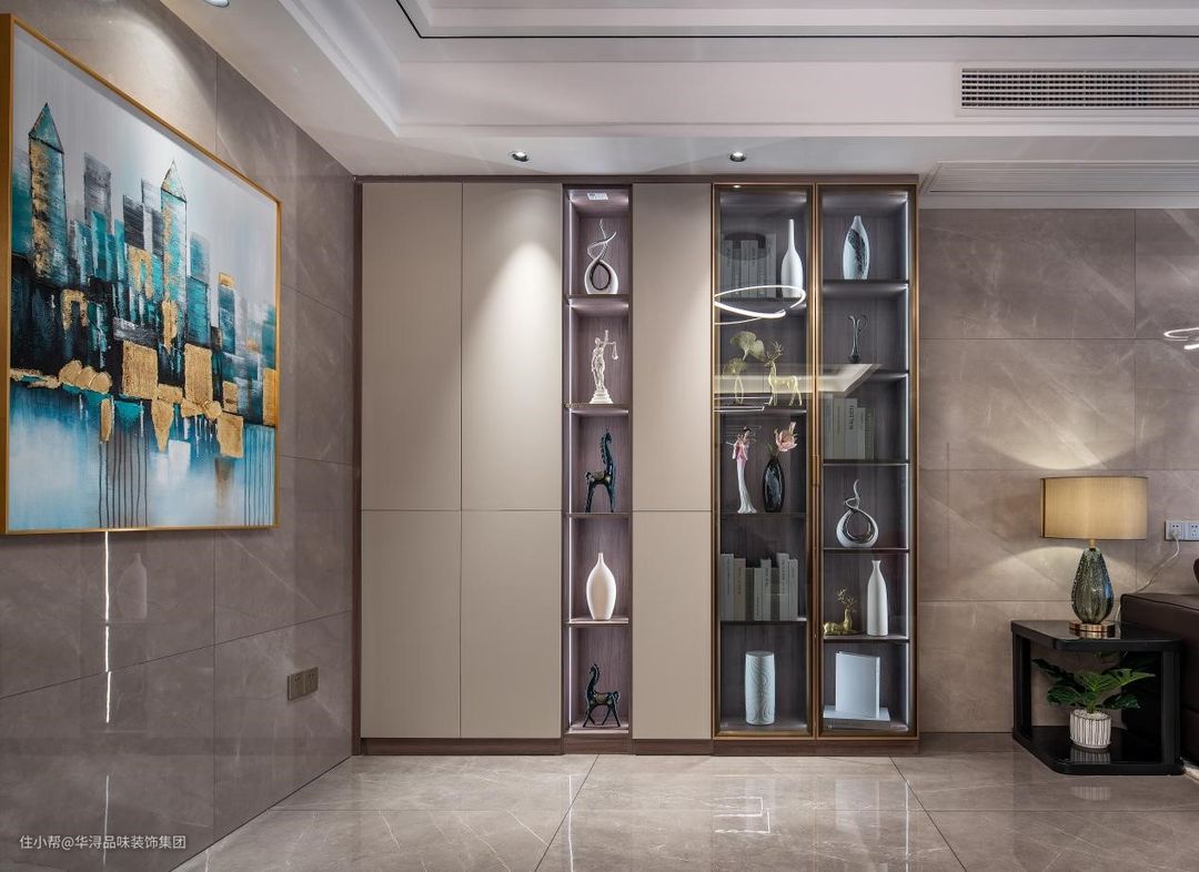 透明玻璃门的收纳柜让整体收纳柜特别精美。一侧墙上又挂了一幅现代城市感十足的装饰画,轻奢之风扑面而来。