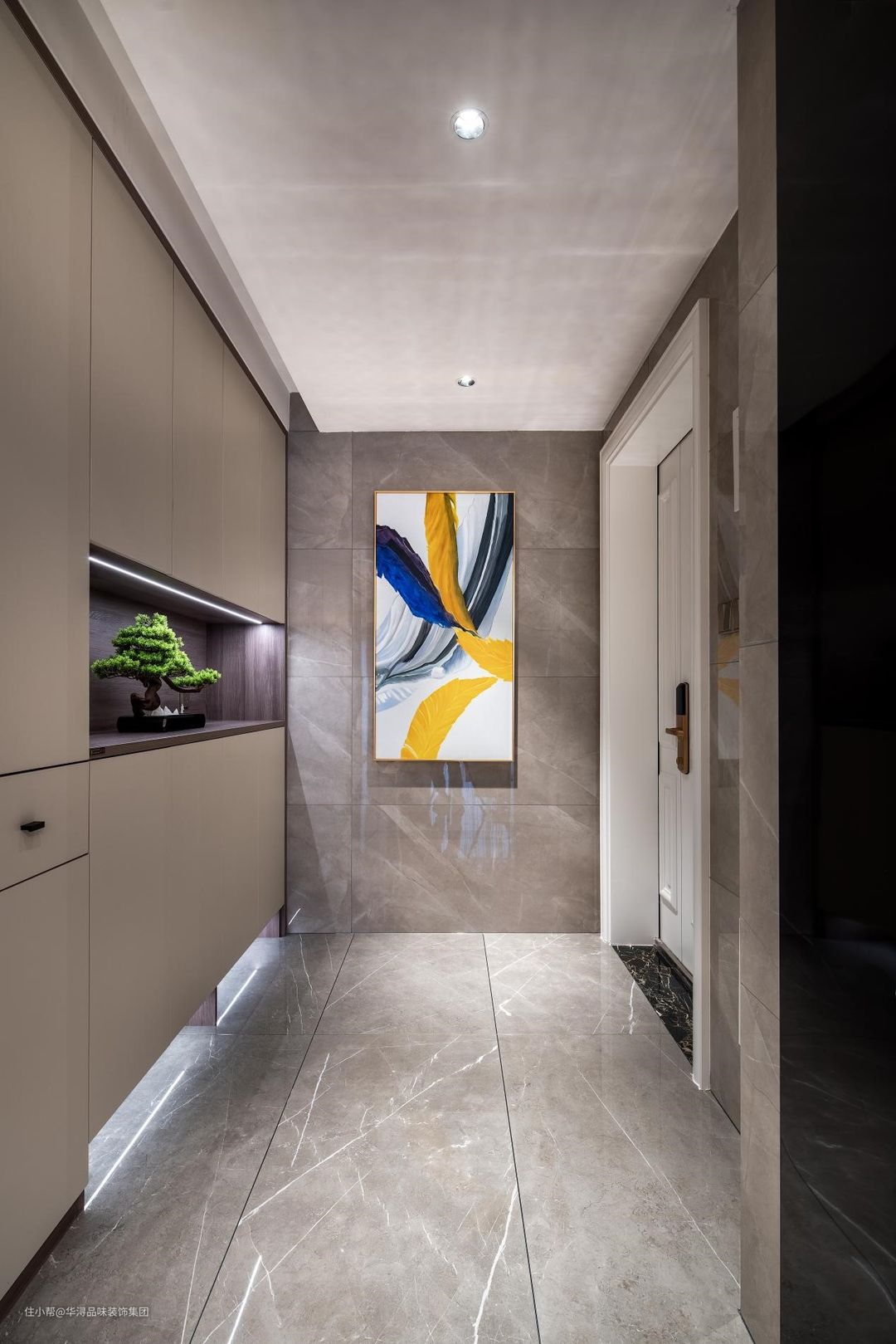 进门一侧墙壁上挂了一幅以黄色蓝色为主的现代装饰画,为深色系的玄关增添了一抹亮色。进门的对面靠墙打造了一整面墙的收纳柜。一面柜子没有完全做到底,留了摆放拖鞋的位置。