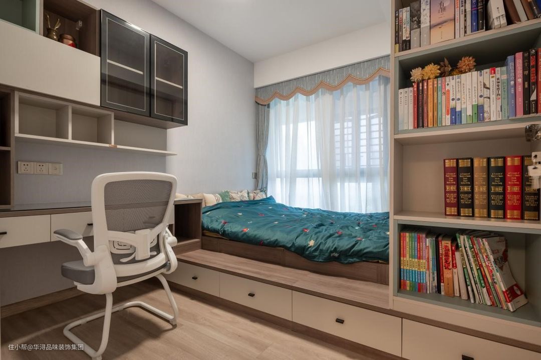 书房以浅色系为主,利用窗台位置打造了一个书桌,学习体验感非常的棒,观景角度也是极佳的。