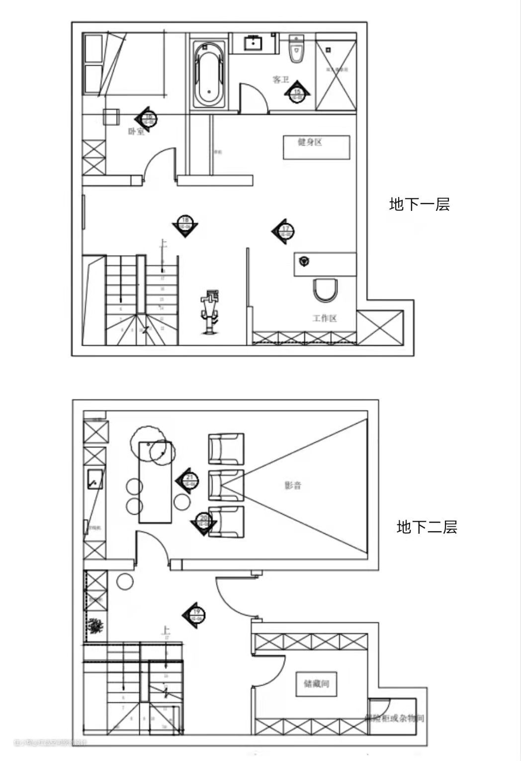 由于地下室层高较高,因此我们对其分为两层,提高使用率~ 地下一层: 主要为功能性区域,在通过采光井,充分考虑光线问题后,我们采用特定的材料,在这一层为男主人设计了书房及以及未来可能会用到的保姆房或客卧。并完美利用开放区域,打造了健身功能区。 地下二层: 为满足休闲娱乐功能,设计了家庭影音室,及衣帽间或储藏间。