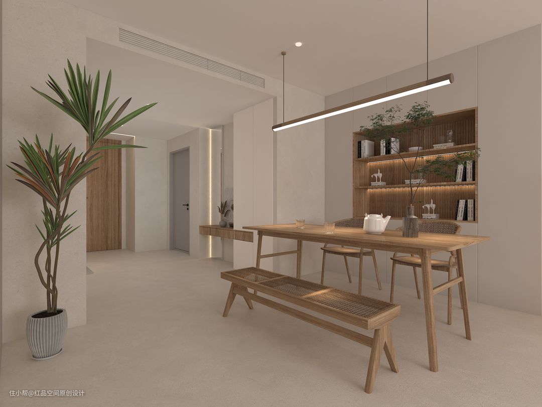 客餐厅一体,多处使用自然效果与光影效果。暖光的使用,提升就餐氛围,亲近自然。