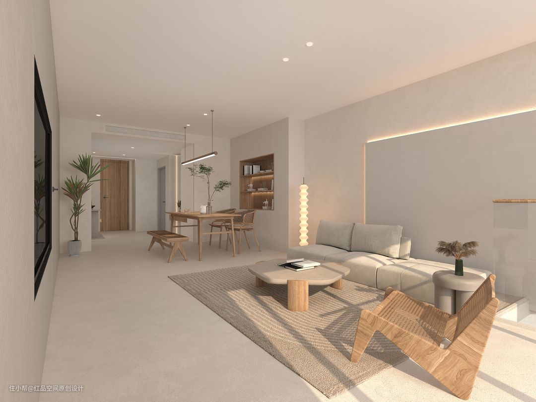 以白色、灰色、棕色等大地色调为主,突出空间整体概念,创造一个纯净无染的空间。在自然放松的氛围下,这样的空间灰给人足够的包裹感、安全感、舒适感,像一种恰到好处的温柔抚慰,给予居住者深深的慰藉。