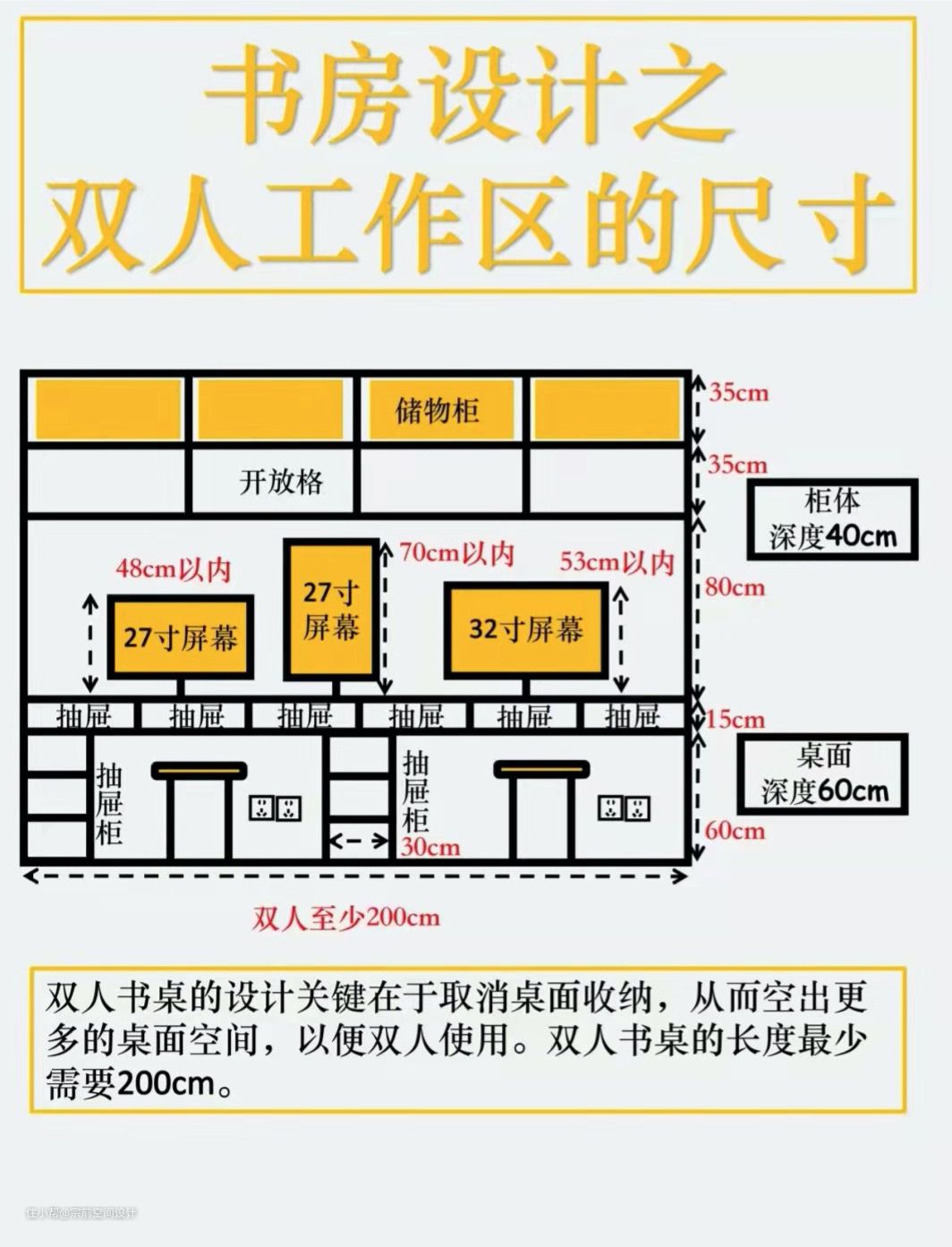 双人书桌的设计关键在于取消桌面收纳,从而空出更多的桌面空间,以便双人使用。双人书桌的长度最少要200cm。