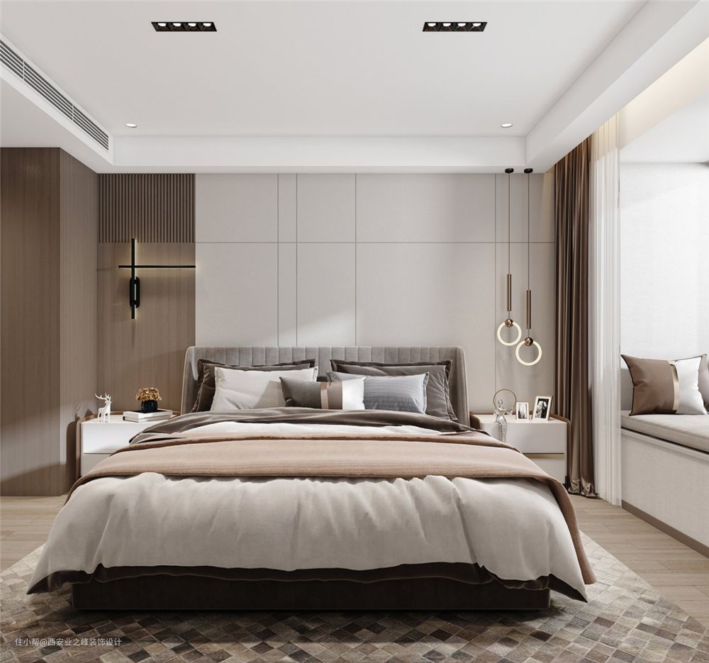 主卧作为忙碌的夫妻二人的放松休憩空间,延续了客厅的调性,柔和的色彩、静雅的线条、安静不张扬,沉稳且低调。也打造了功能多样的私密空间,卧室内卫生间、衣帽间、飘窗,适意的空间里所有的疲惫在休憩酣眠之后尽皆消散。