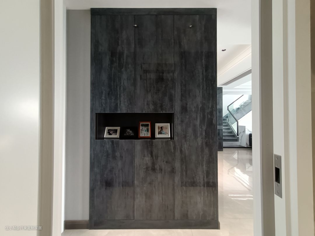 图2 | 二楼过道入墙式设计,相比图1多了玻璃柜,高光门板结合灰玻璃门,整体更精致亮眼,嵌墙式更释放空间,小户型也可采用。