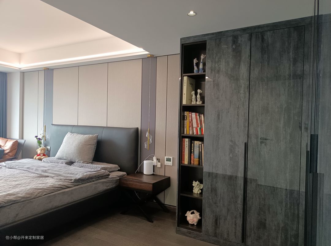 图8-9 | 次卧打造了L型衣柜形成黄金衣帽区,一面嵌墙形成凹凸有层次的视觉感受,开架与玻璃柜交叠期间,床头护墙错色拼接,都很简练精致。