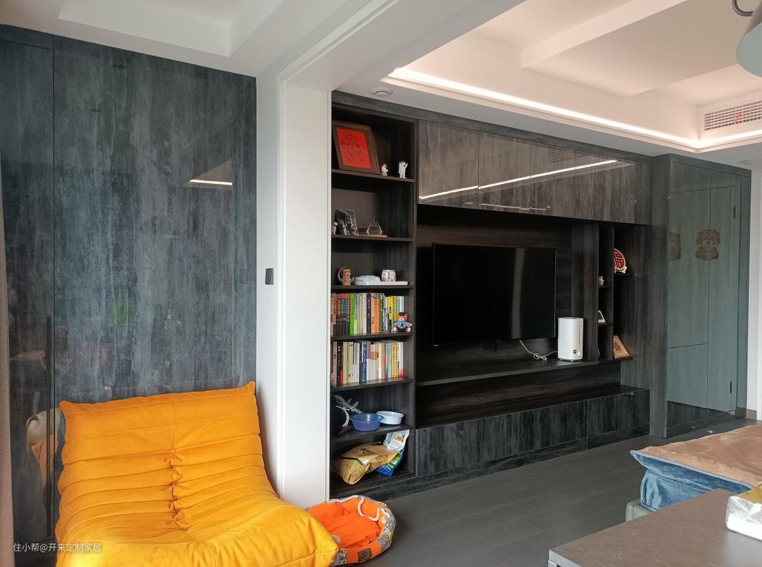 阳台柜一边做封闭性收纳柜,一边开放性书柜与书桌一体设计,高柜与开架合理分区,打造出休闲区与学习办公区~