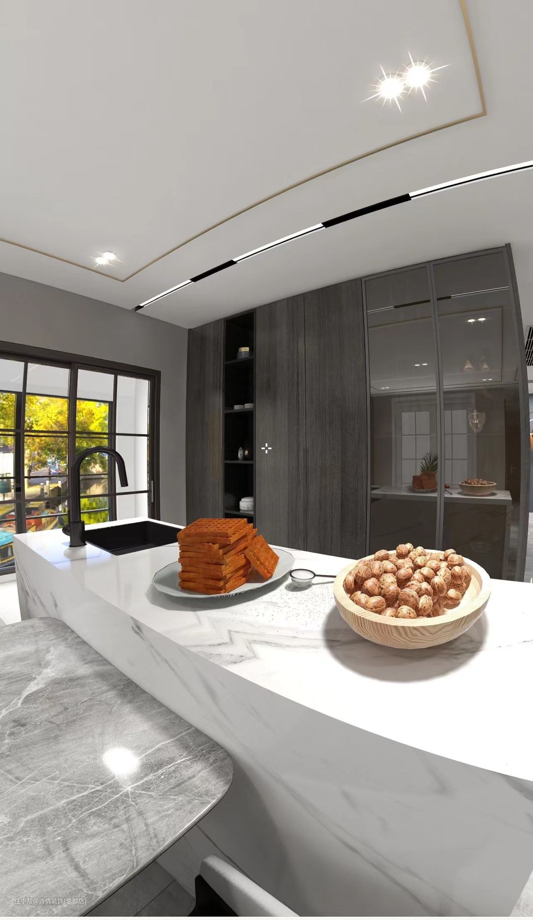 进房间是设计的开放式厨房,业主为了最求精致生活不将就,每个位置的设计都充满了设计感。