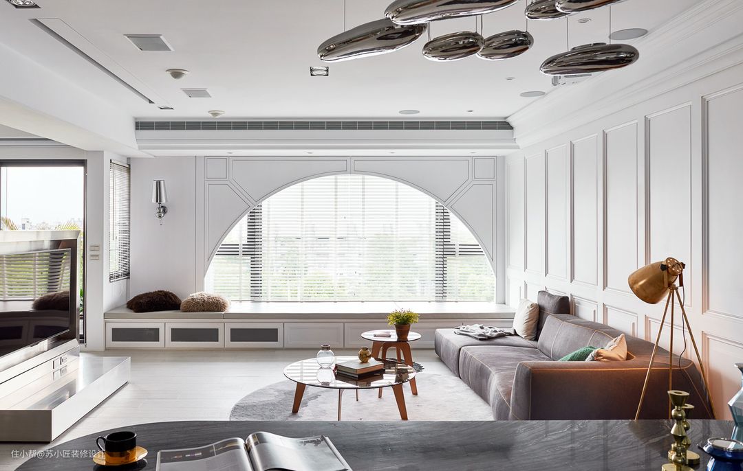 如果要说一种百搭选择的话,那就是白纱+灰帘。一般家庭窗帘都是一层布一层纱,当然具体还是要看自己家的周边环境和使用情况。比如高层的客厅,没隐私问题,客厅只要一层白纱足够了,选择那种透光不投影的就行。如果是在路边的低层,那还是得老老实实加一层布,不然晚上路人把你家里看得清清楚楚也不方便。白色的纱+灰色的布这种搭配基本上任何装修风格和配色都能 Hold 得住。