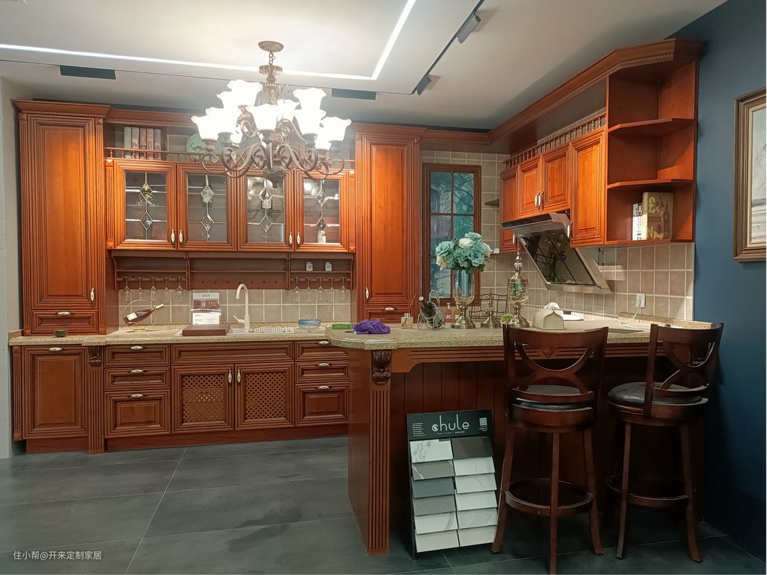 看设计,台上吊柜与抽屉结合,玻璃柜与开架结合,地柜错层,岛台一面设收纳抽屉,一面留空做吧台。