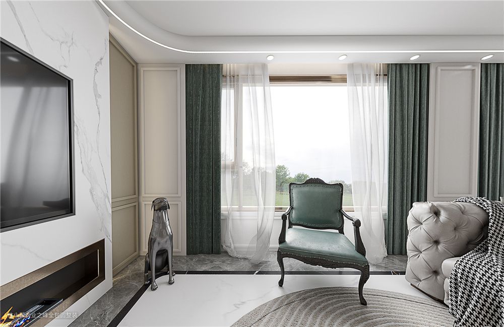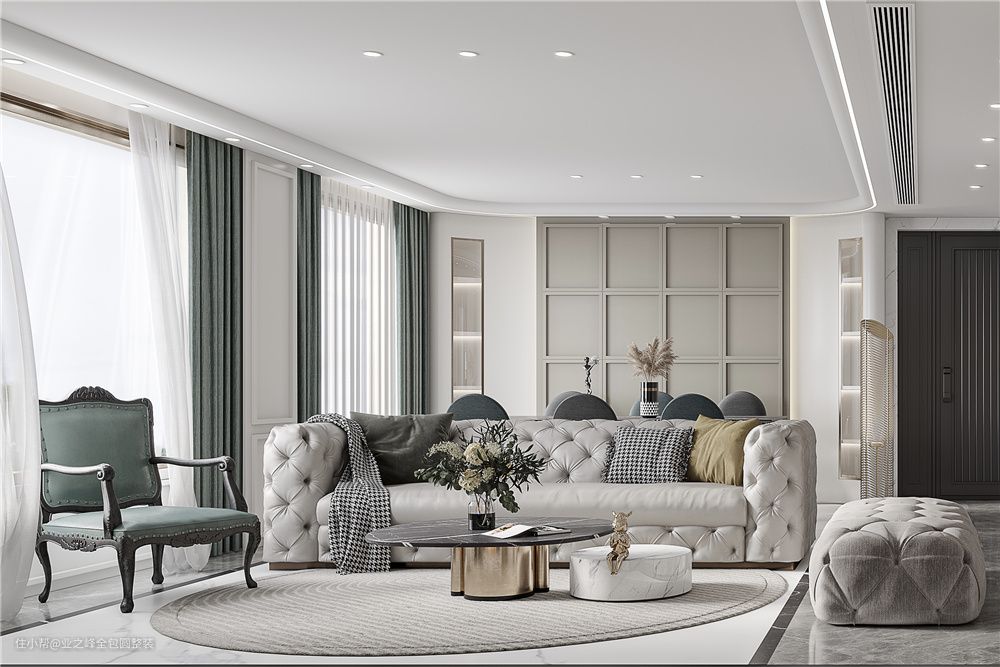 沙发采用纽扣浅灰色系,浪漫优雅 柔软自在。窗帘采用墨绿色搭配一层仙气十足的纱帘,营造温柔舒适的家居氛围;适当的留白,给家更多想象的空间。