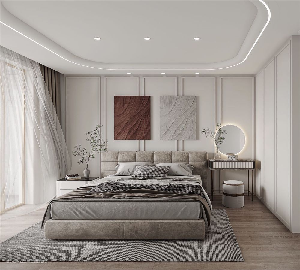 卧室+衣帽间+卫生间组成的主卧,俨然是一个舒适的小套间系统了,给业主夫妻最舒适的私人休息空间;配色简洁大方,虽然很简单,但是很舒适。