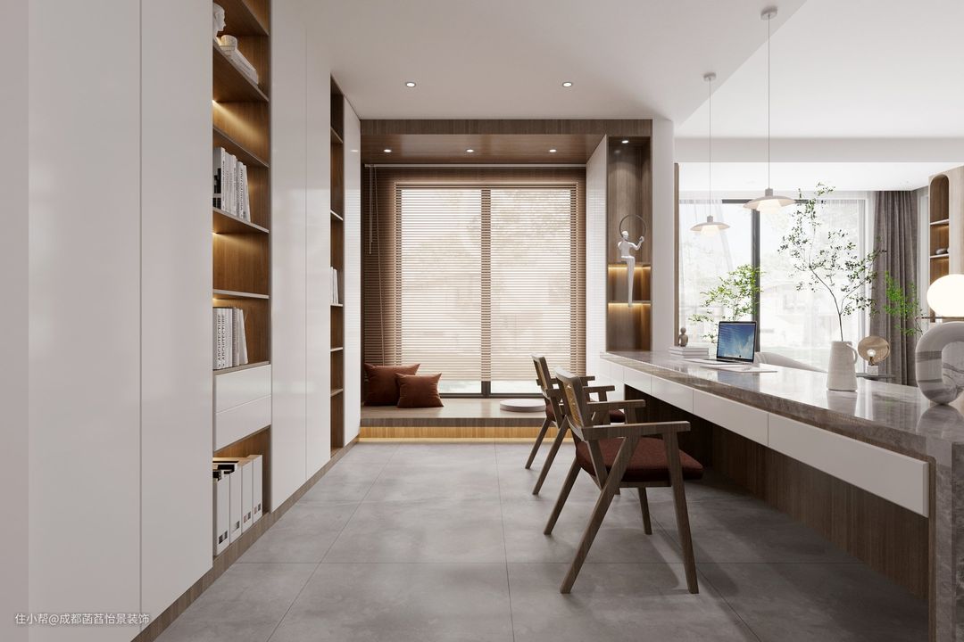 客厅背后的开放式书房,整面墙的定制收纳柜,超长的书桌,可以满足两人以上同时使用,桌上的一株绿植,让这个空间更清新。阳台做成地台式设计,一张地垫两个抱枕,就可以安安静静享受午后时光。