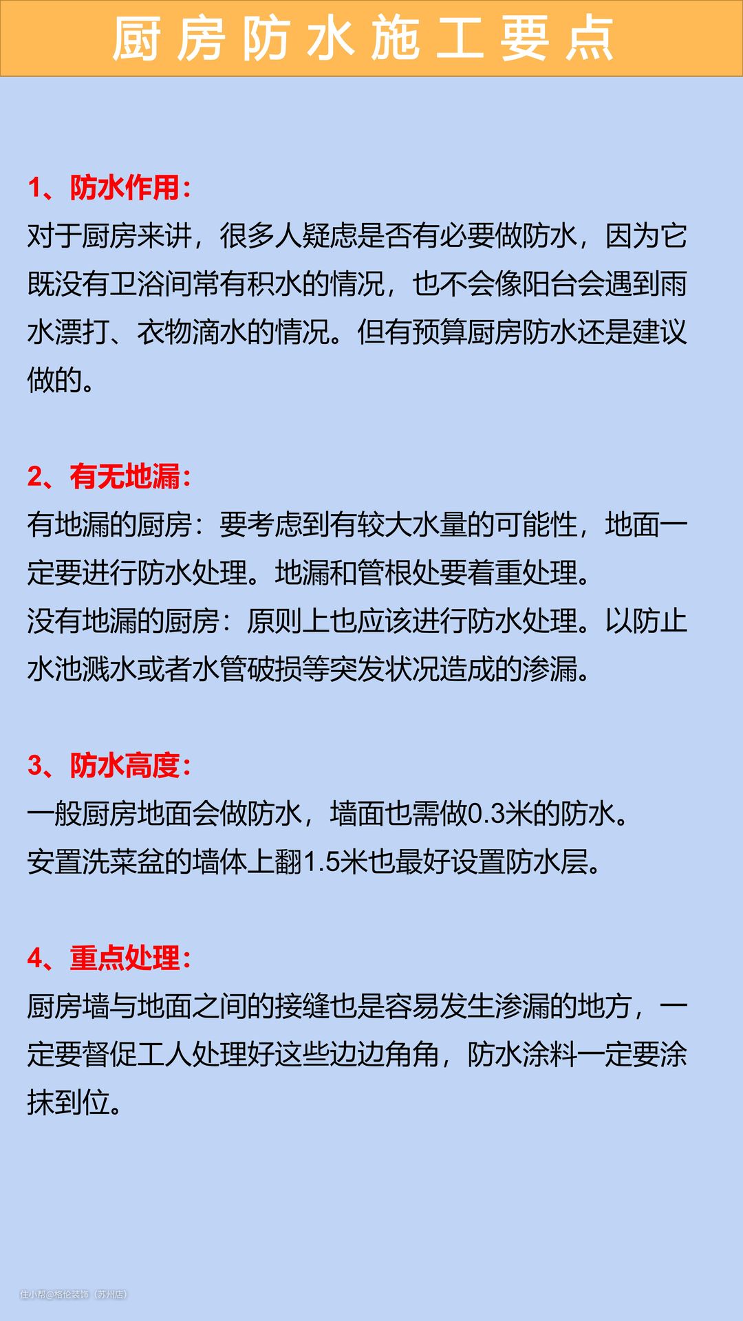 🌟尤其是功能性极强的厨房和卫生间,必须做好防水!否则将影响房屋的整体质量。