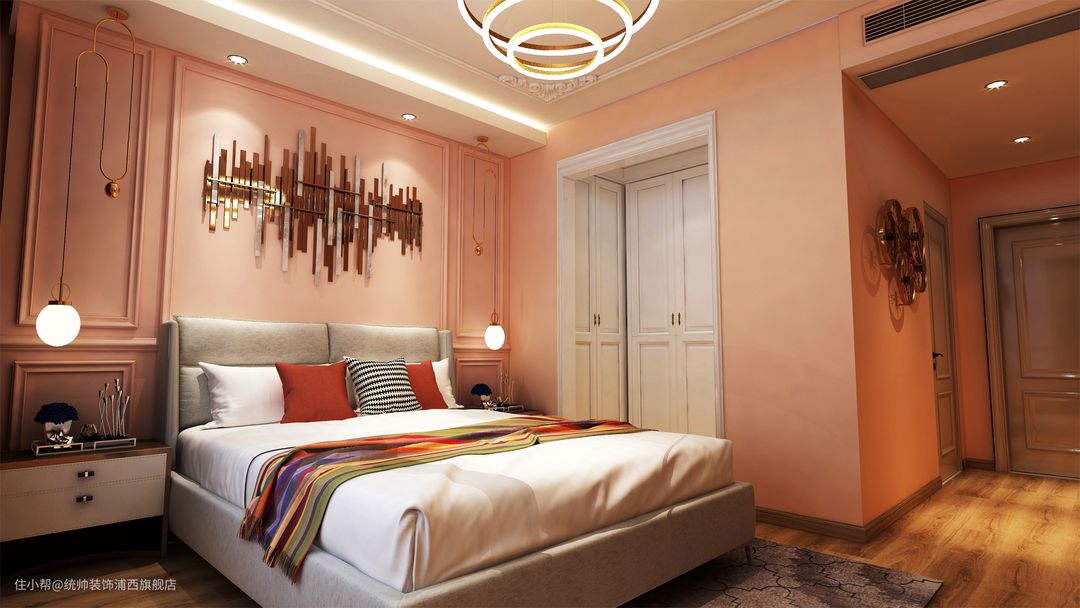 主卧选择藕粉色搭配白色,营造出了一个温馨的卧室。主卧配有衣帽间和独立卫生间。