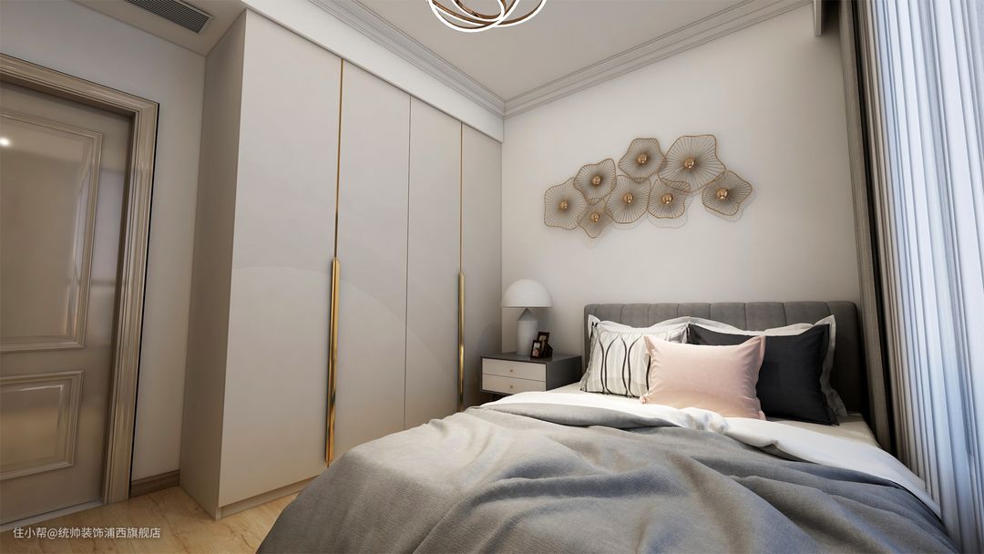 次卧相对来说就比较简单干净,一张双人床和衣帽柜是卧室的标配,金属线条组成花朵模样,装饰着本身单调的墙面。
