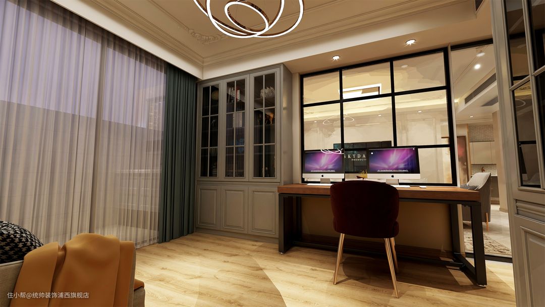 沙发背后的小房间设计成了书房,进书房的门的一侧延伸,上半部分是玻璃设计,引入光线,也能从视觉上拉大空间面积。