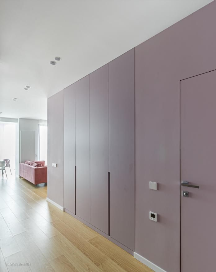 比如这位业主就在主卧的床尾处,利用整面墙定制了一款嵌入式衣柜,低饱和度的颜色看起来就好像一面墙,强大的收纳能力、高级的美观感受二者兼得。