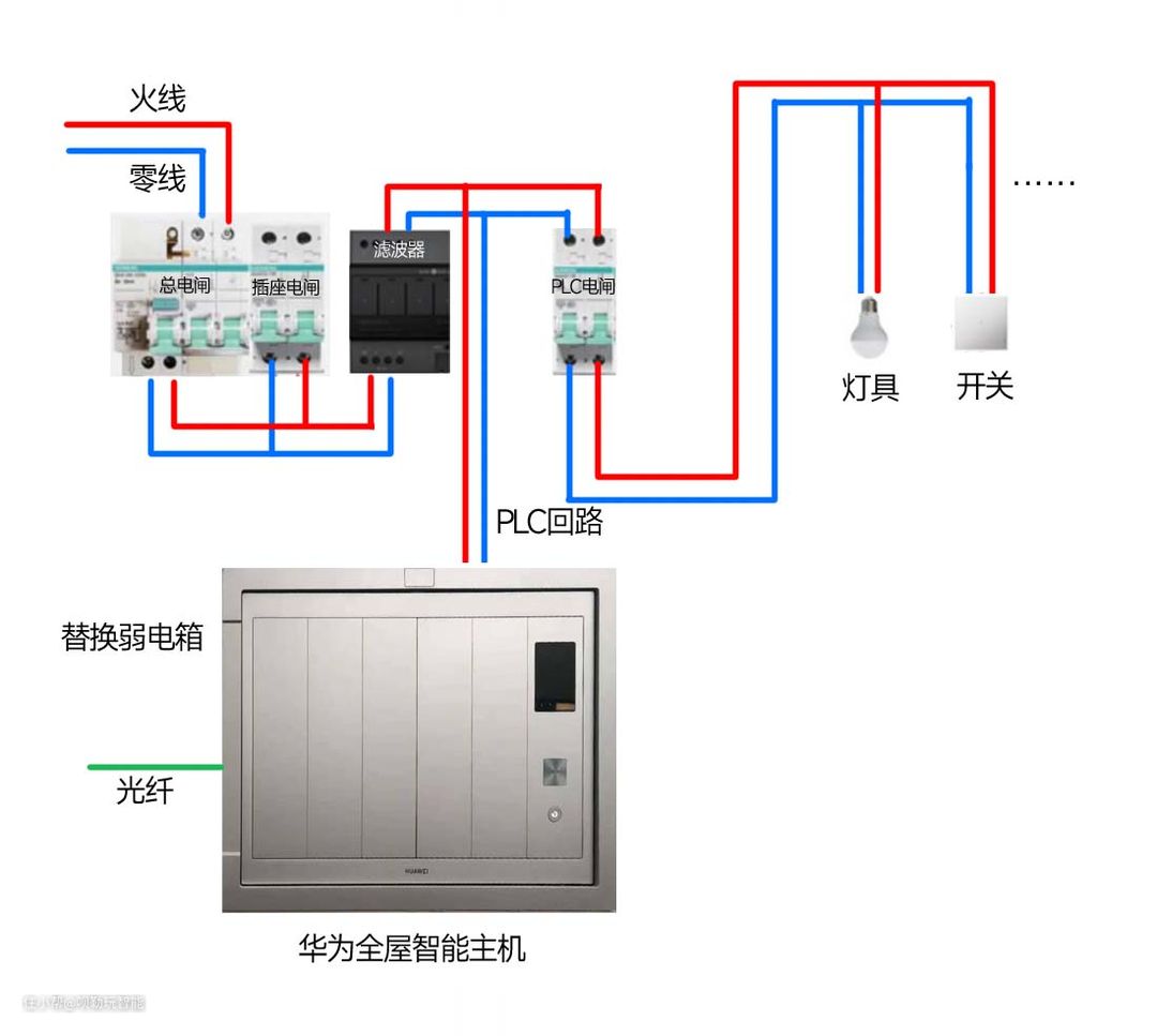 华为智能家居布线方式其实也很简单,从入户电进入后通过滤波器再进入主机,再与智能设备相连接。滤波器的作用就是滤除电源干扰,提高PLC通信稳定性。