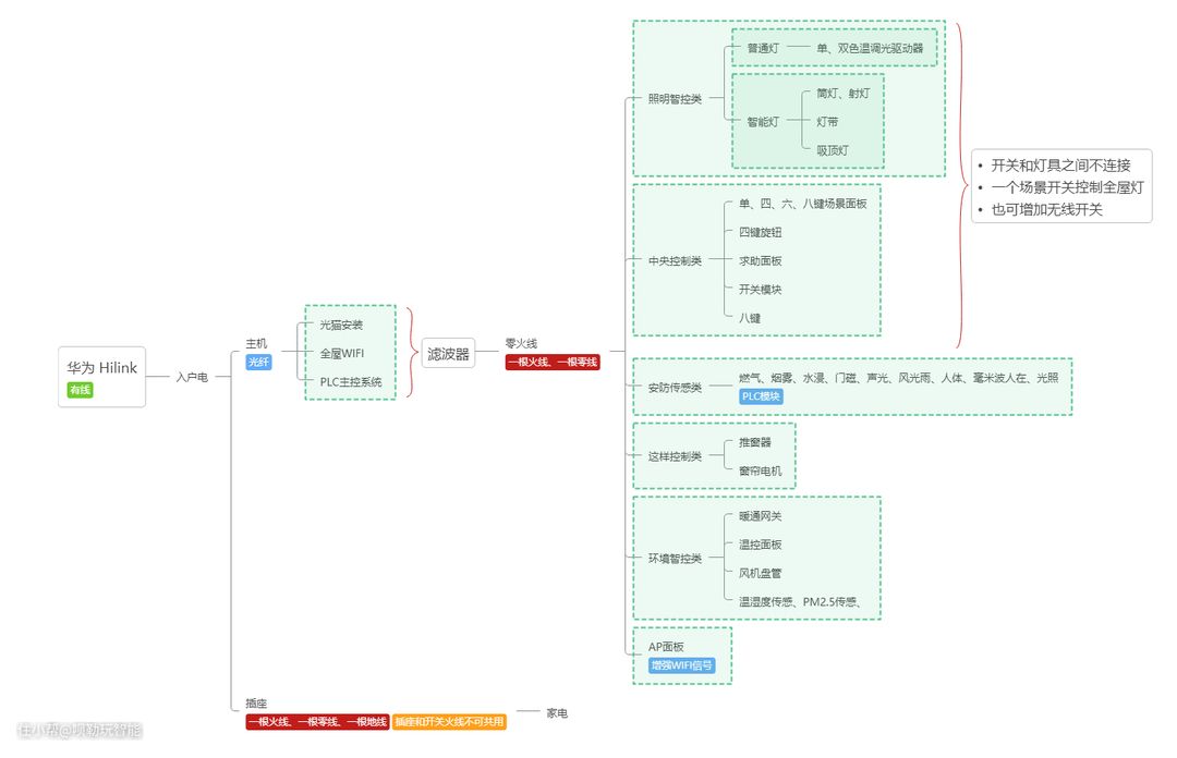 然后再从滤波器出来到每个开关、灯具、传感器的位置。也就是说每个要接入华为Hilink的设备都需要有零火线为其提供电源(一根火线、一根控制线),与传统的布线还是有区别的。这里还需要注意的是插座的电源是不能接入滤波器和主机的,所以开关、灯具等的布线是不能借插座的火线。从布线上看与传统不同的就是,开关和灯具直接是没有关系的,也不需要像传统布线一个开关控制对应的灯。这就是智能灯光系统的优势,可以实现一控多,或者多控一的。