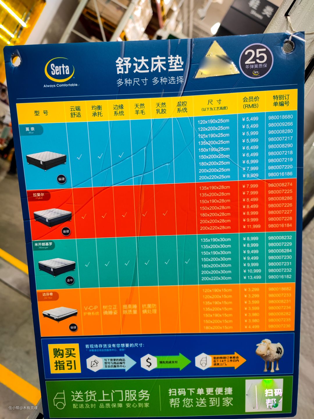 通过网上各种丰富的拆床垫视频学习,也去朋友家躺了一次繁星A,我很快淘汰了睡感偏软的繁星A,主要还是个人的喜好更偏向支撑型一些。于是把主意放在了山姆的舒达系列,并马上去山姆试了一下。不得不说,舒达在山姆的几款性价比都很高,万元都能搞定。其中拉斐尔睡感和舒达爆款阳阳真的一模一样,但优惠完才6000多,当时差点当场下单。