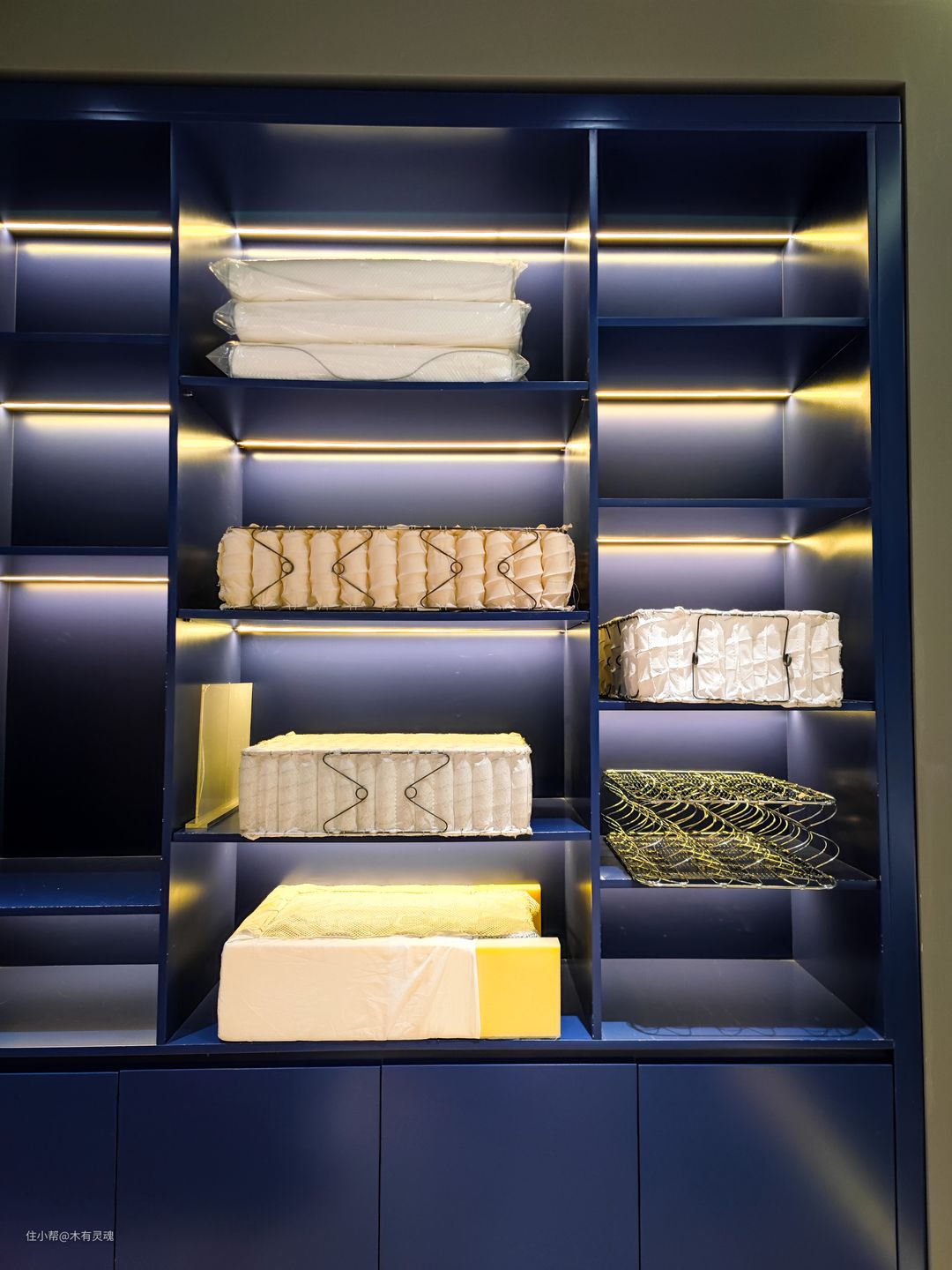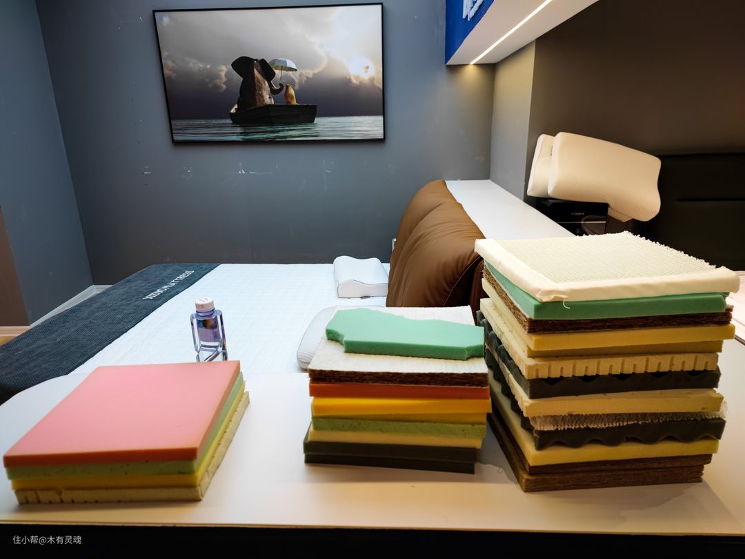 基本上那天就是各种让服务人员帮忙搭配各种不同规格不同层次的床垫,也学习了不少知识。比如都是海绵+乳胶+支撑材料+弹簧,乳胶厚1cm睡感的包裹性就差别巨大,而如果把支撑材料转到最顶上,海绵下移,会还原出一种棕垫但Q弹的感觉。