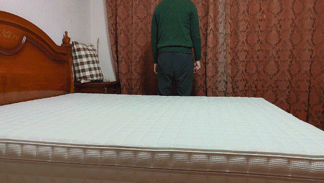 真人演练,没说的,屁股小面积受力的一瞬间床垫并没有大面积的塌陷,整个人自然得躺下来力量吸收得很好,后躺演练效果是绝对一流的。