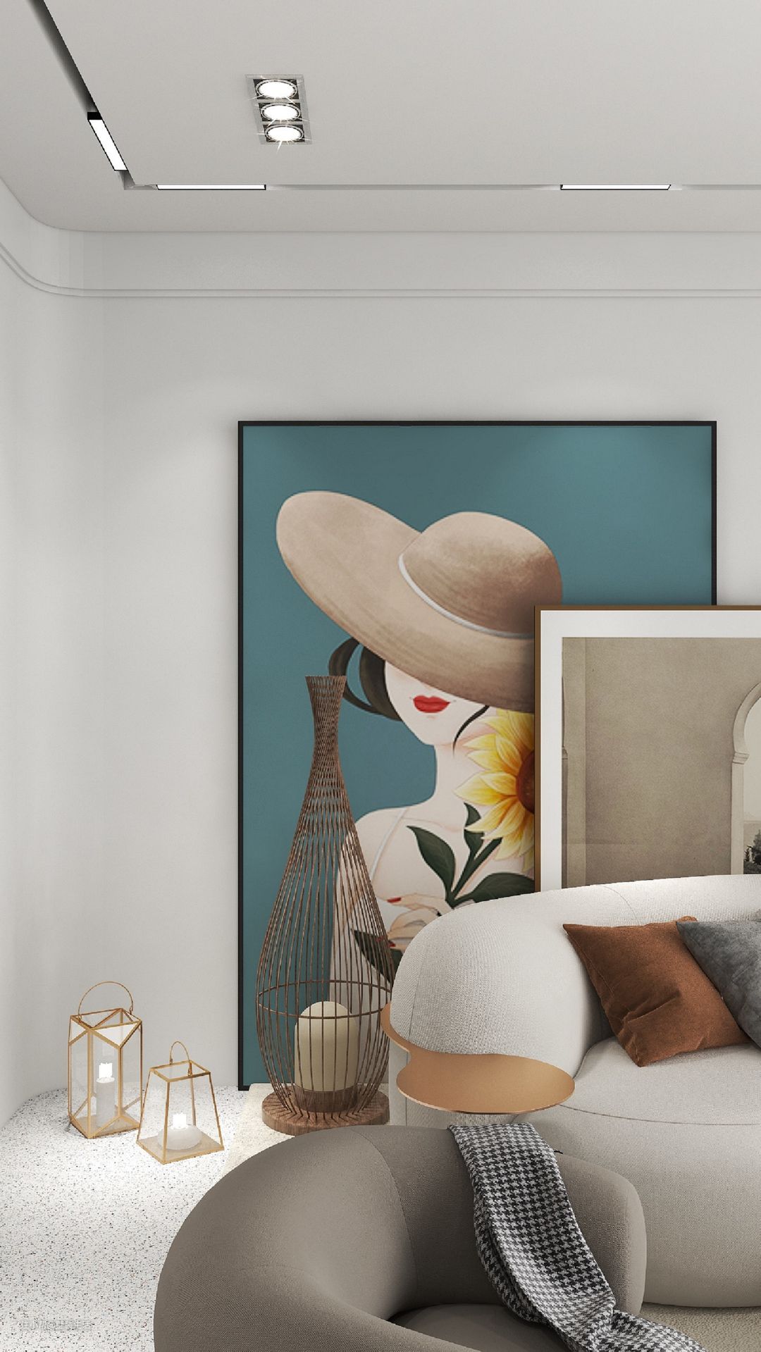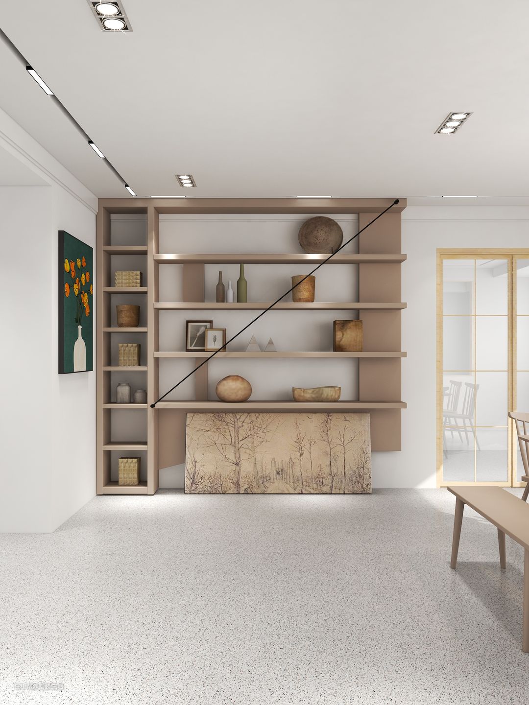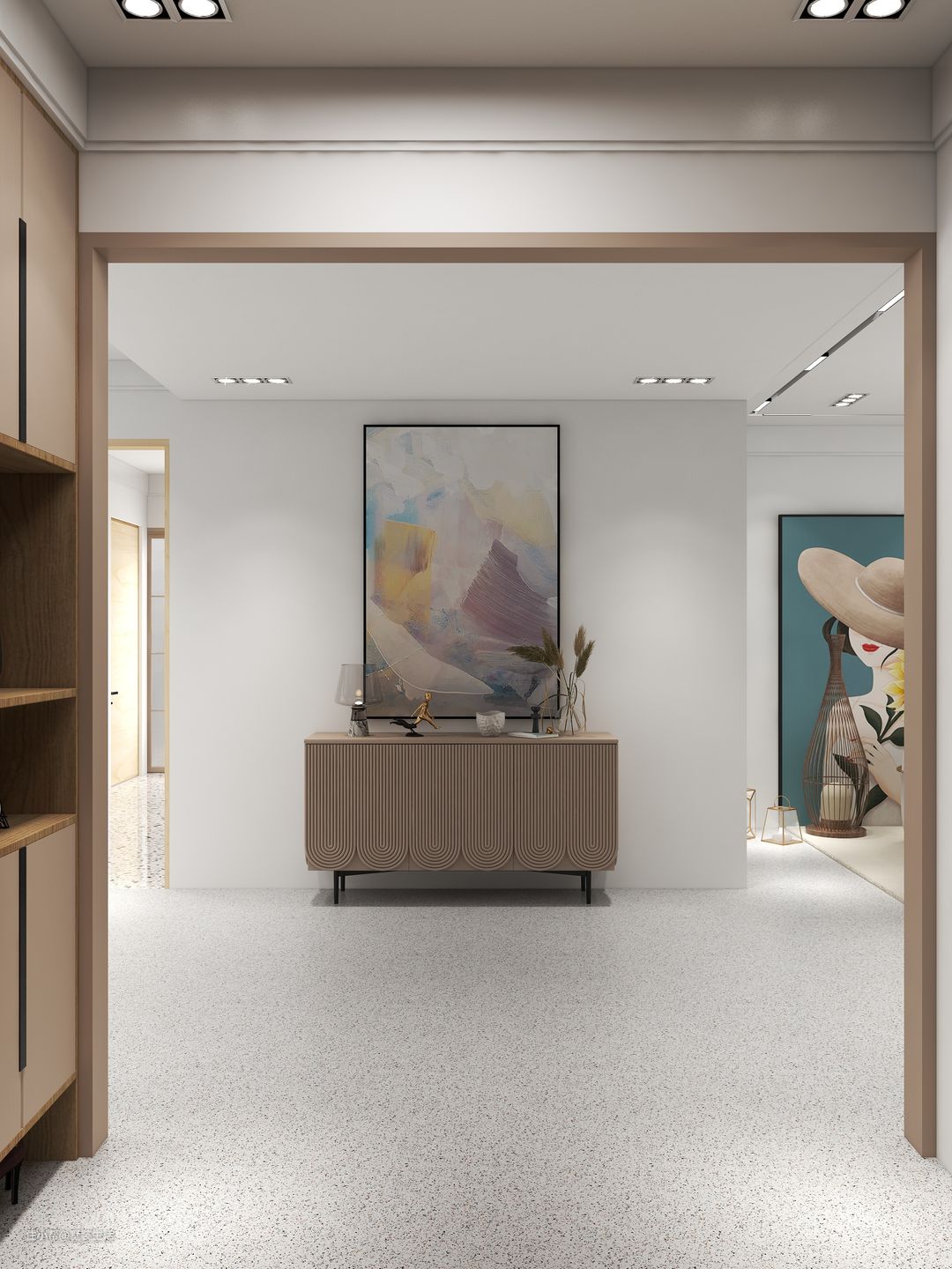 雾霾艺术画以及金属装饰配件的点缀,为整体空间增添了一抹亮色,使空间具有灵动性和艺术感。
