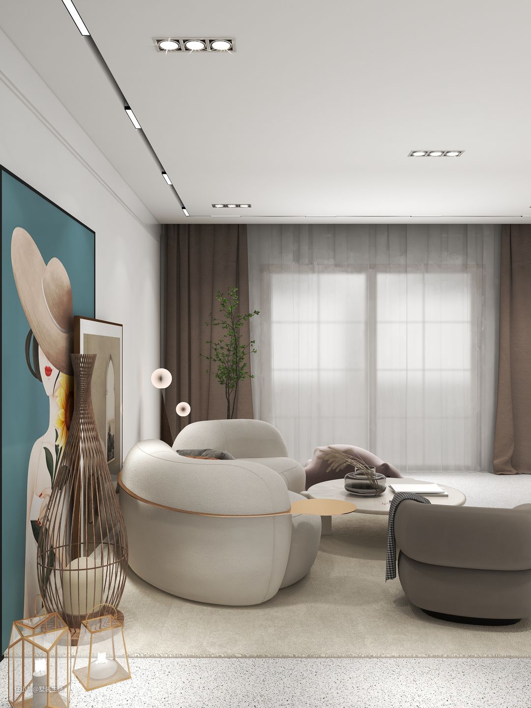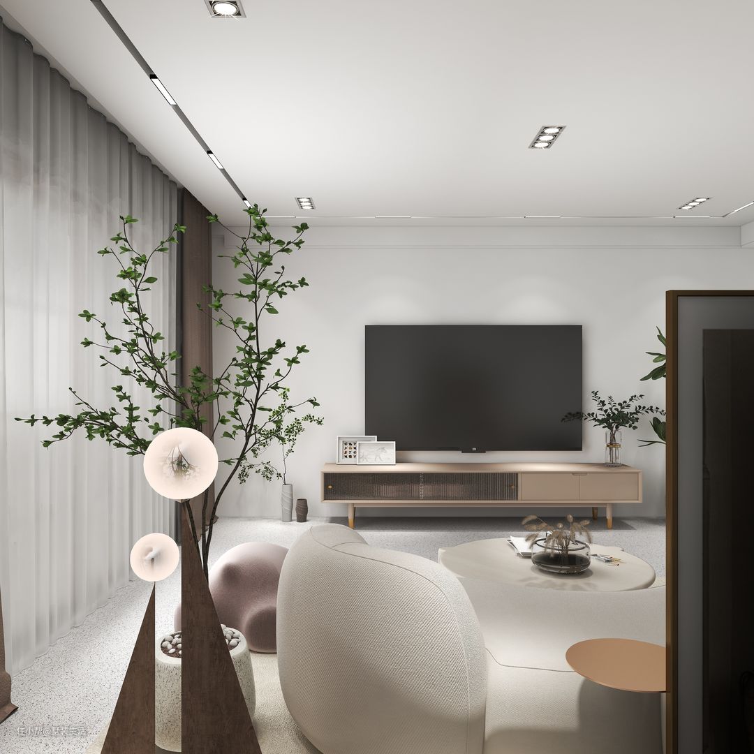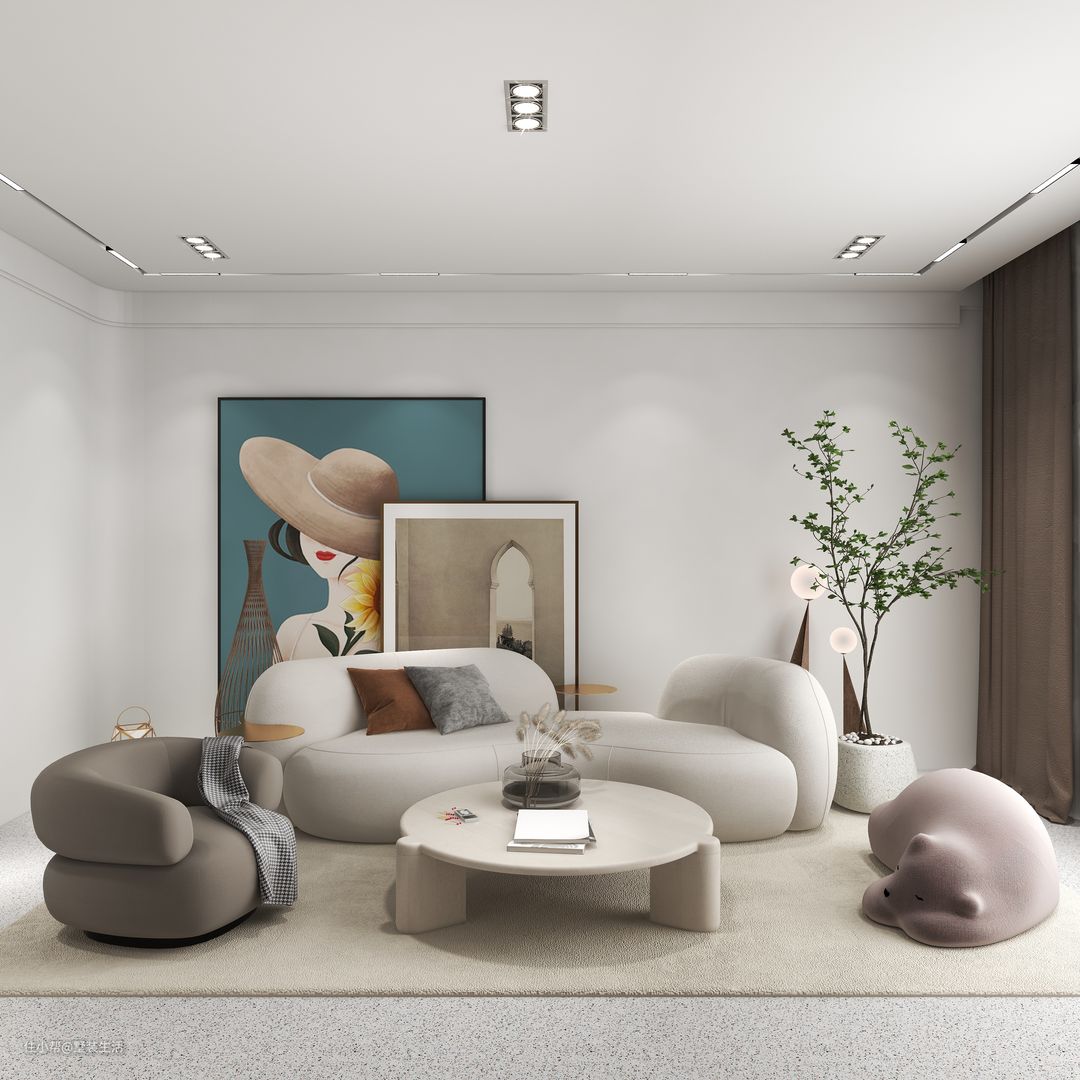 客厅采用无主灯设计,通过筒灯和灯带提供光源。窗户选用了大面积落地窗,为整体空间引入自然光源。奶白色沙发和地毯搭配玩偶沙发使得空间整体温馨和谐。
