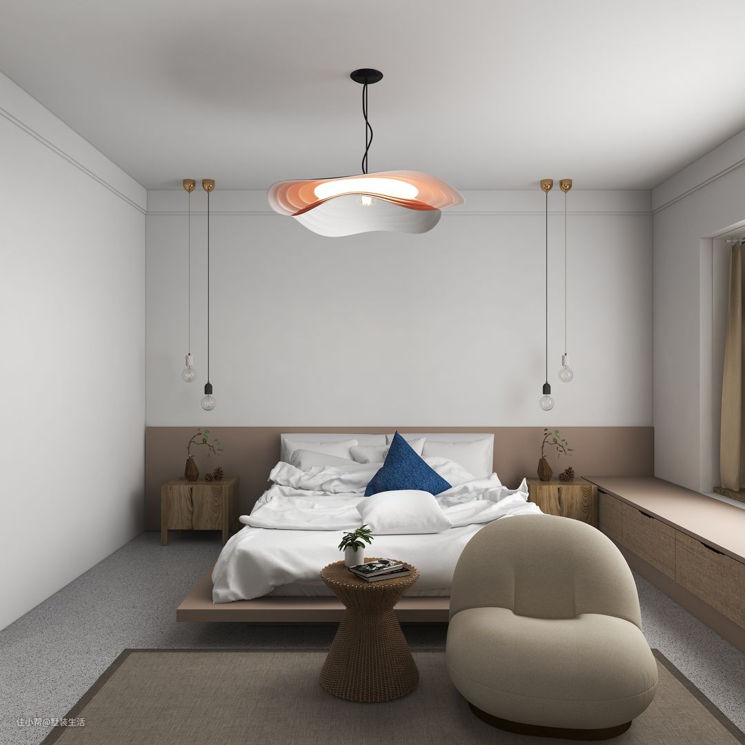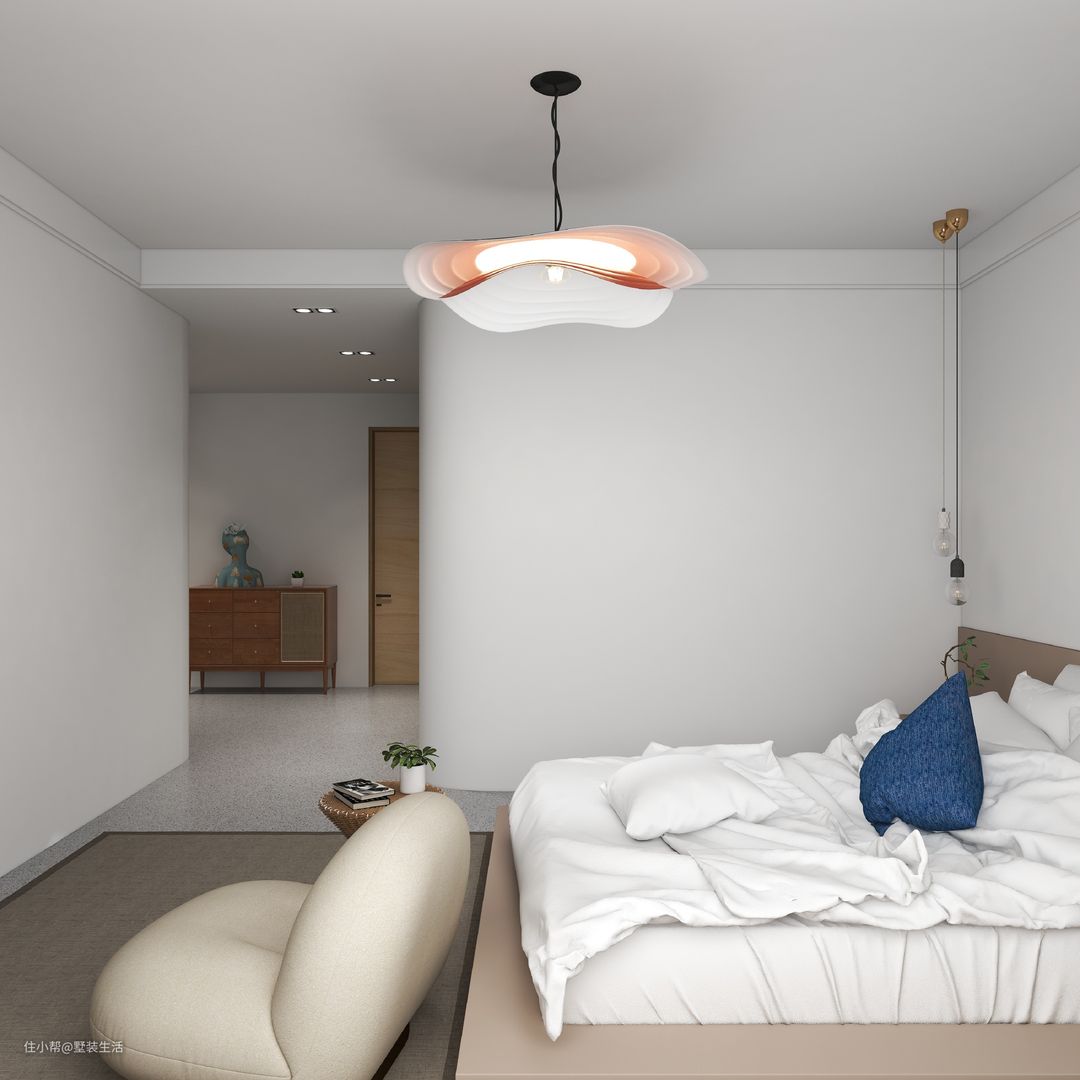卧室以纯粹的白色系搭配温暖的木色系打造简约舒适的空间,主灯与辅灯相搭配,主灯添加设计与层次,辅灯烘托氛围。