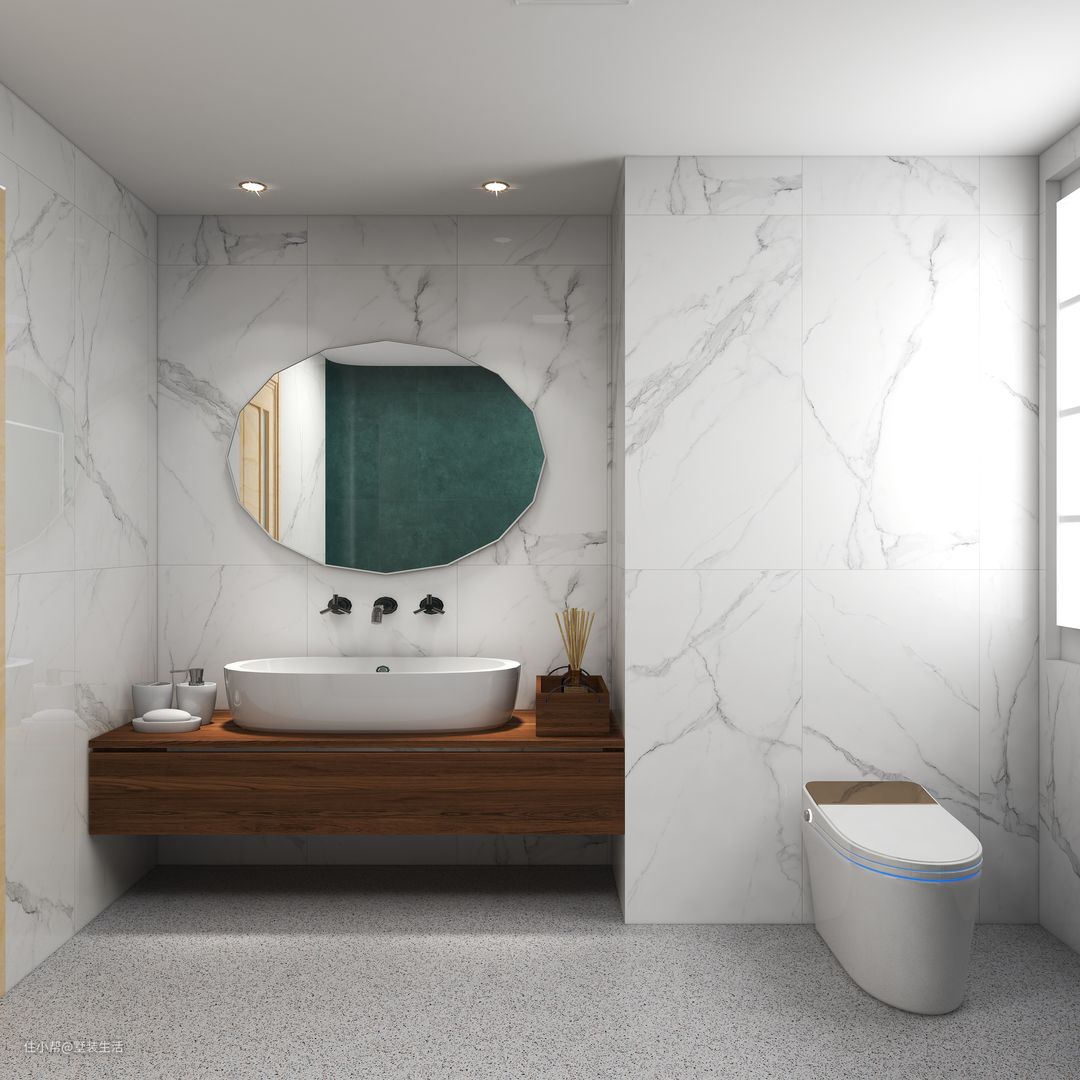 卫生间整体以大理石墙面为主,在功能分区上做了干湿分离,将洗漱和沐浴分开。空间色调以灰白为主体,搭配墨绿色涂料,升级了空间的高级感。