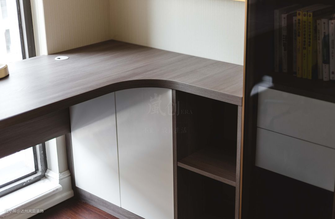 因为所有卧室空间都是做了落地窗的设计,为了不影响采光度,所以靠窗的书桌位置是做的壁挂式设计,转角的下方做了一体式的储物柜,同样是开放格和储物柜的结合,进行多功能收纳。