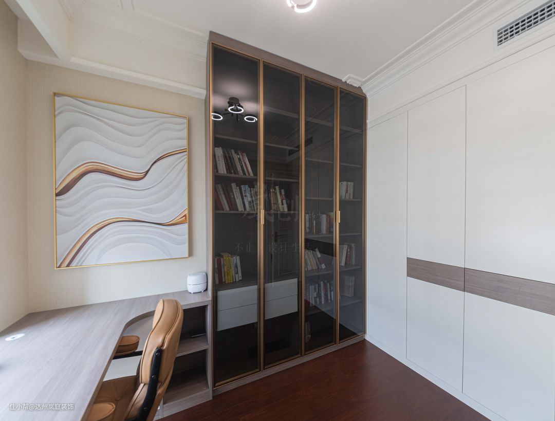 虽然是书房,但也是一个衣帽间,是一个真正的多功能房,靠窗做了转角的书桌,哪怕是两人三人办公也足够,一半做了顶天立地书柜,黑色玻璃柜配以金属线条的边框和把手,虽然是书房,但设计师坚持将精致进行到底。