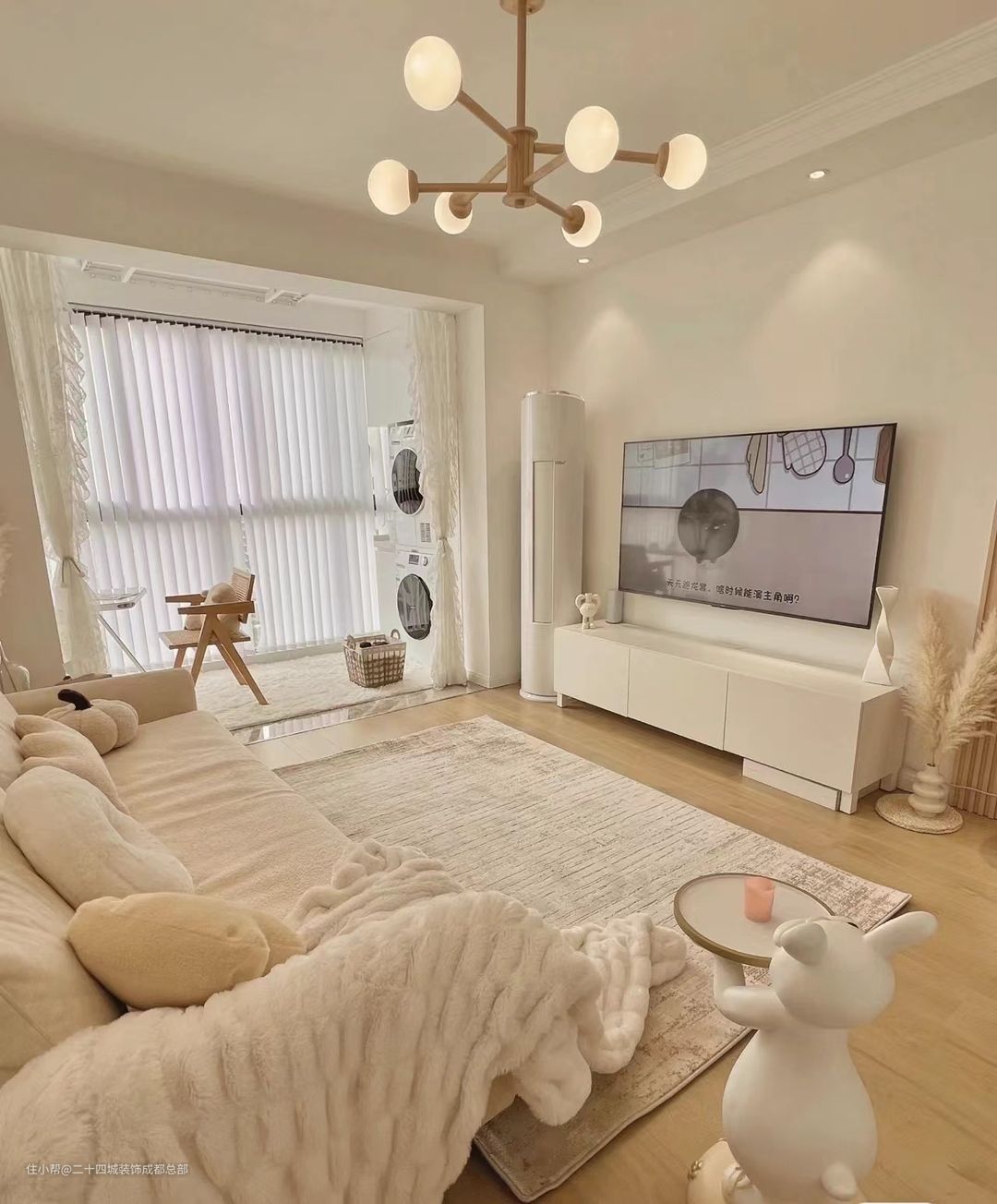 全屋大白墙,不仅视觉简洁,显得空间更大,随处都可以进行投影,营造不同的氛围感,只在电视背景墙上方做了局部吊顶走水管,让空间层高不被压缩,地板通铺,不仅有延伸感,而且环保又安全,美观效果也很好,舒适的脚感更是让人身心放松。