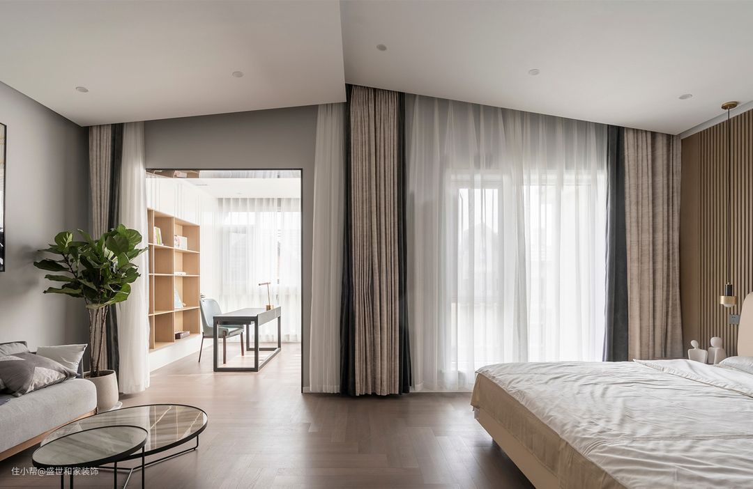 这套别墅的主卧位于三楼,为了保证居住的绝佳体验,因此除了休闲阳台+洗衣房,其余空间都被规划为主卧套房。