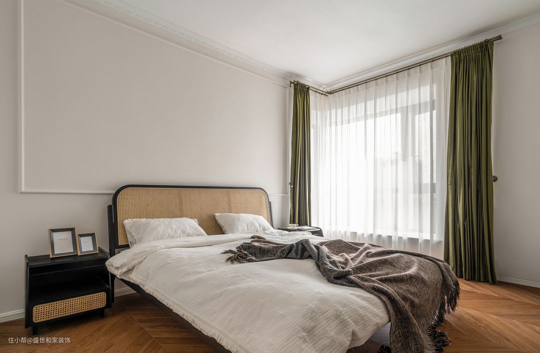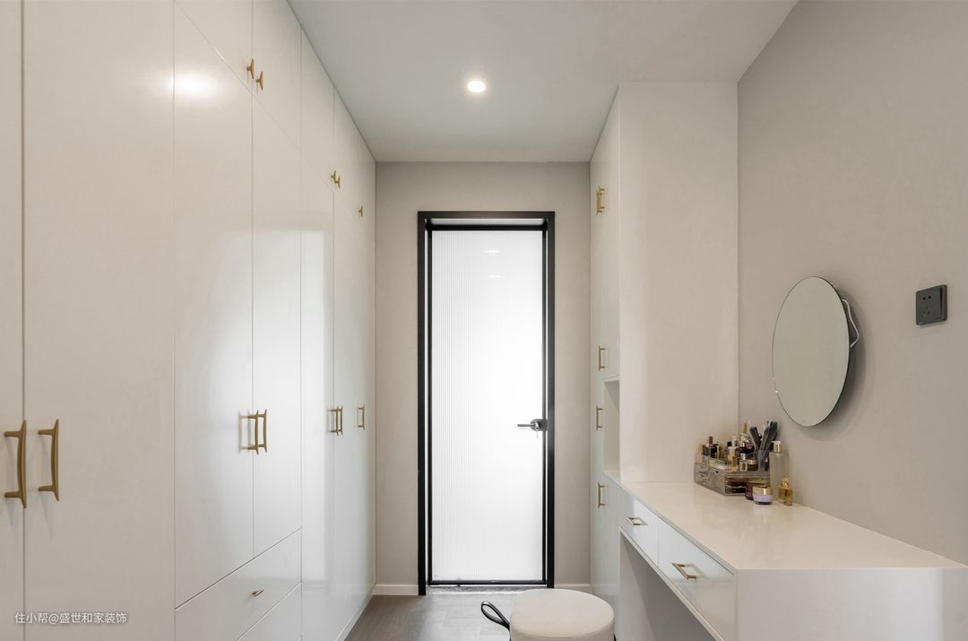 主卧原始户型是卧室+衣帽间+卫生间,但是衣帽间面积不够大,显得较为狭窄;因此为了能够改善这种情况,这套主卧衣帽间改成开放式,这样既能保证收纳也不用因为过度隔断导致室内空间逼仄。