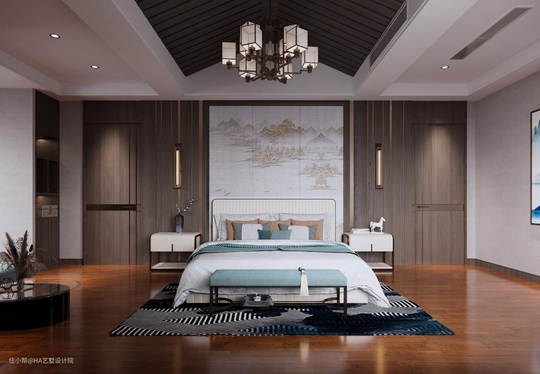 主卧的装修带有浓郁的中国风气息,黑色的实木隔山做成了有坡度的吊顶,让吊顶变得更有氛围感了。