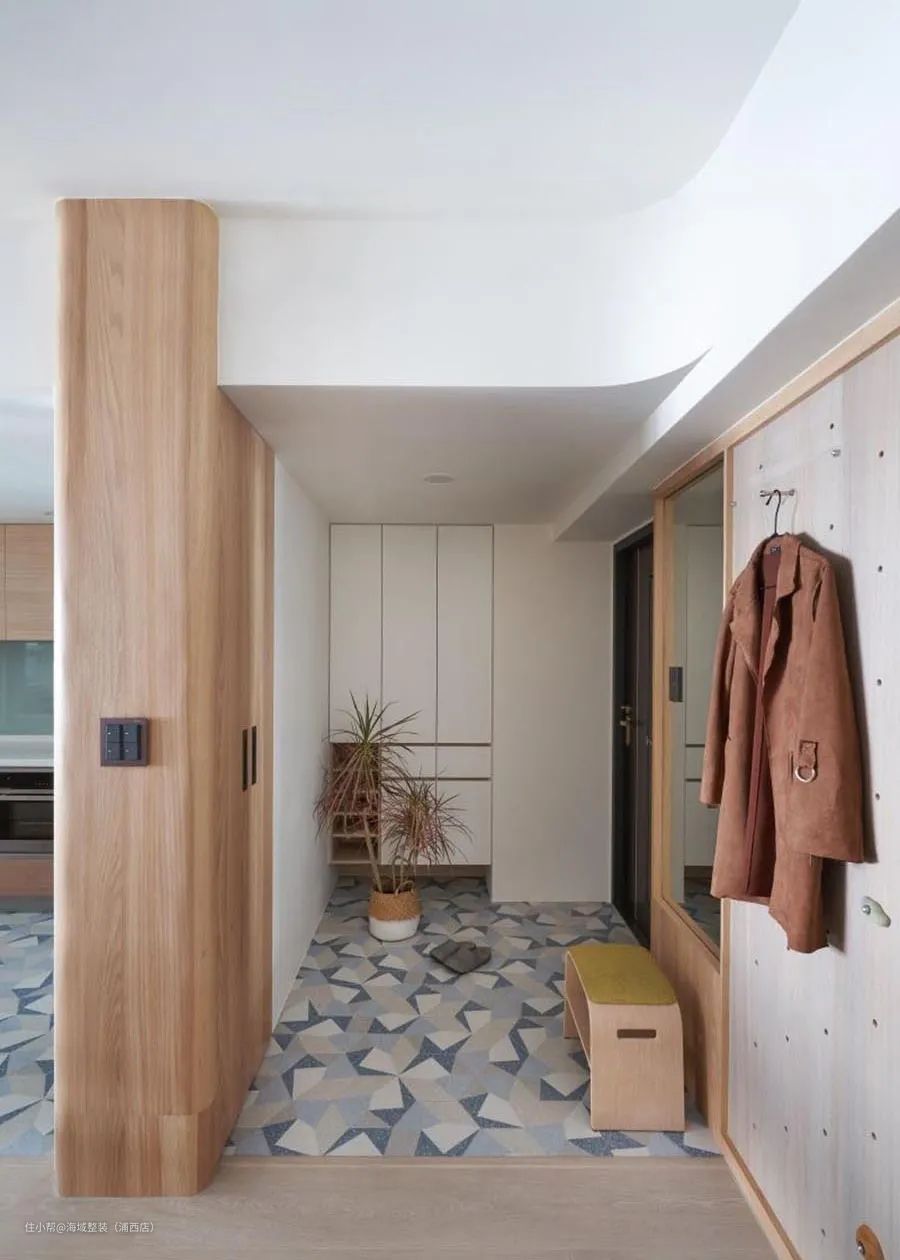 如果您家开门就是客厅这样的开放式空间,但同时想保留一定的私密性,那您不妨试一下这样的玄关设计: