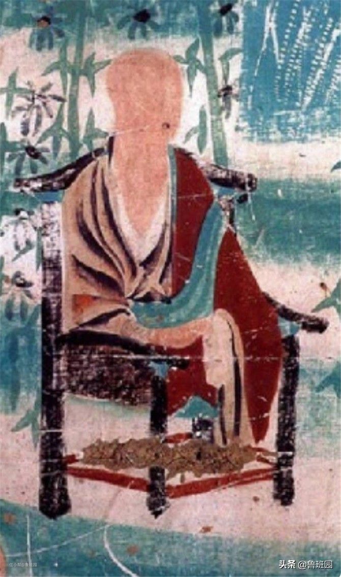 下图为敦煌莫高窟285窟窟顶西魏壁画中的佛像。该僧人跪坐在一把有搭脑、有扶手的木质椅子上,该椅子的坐部画作斜线网纹,显然是编织物的表达方式,因此称之为“绳床”。