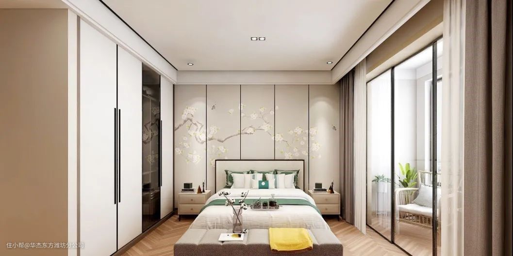 4.主卧背景墙没有采用现代装饰画,而是中国风元素,木质地板及整体调色稳重雅致,遮光帘和床尾凳的配色也相互呼应。