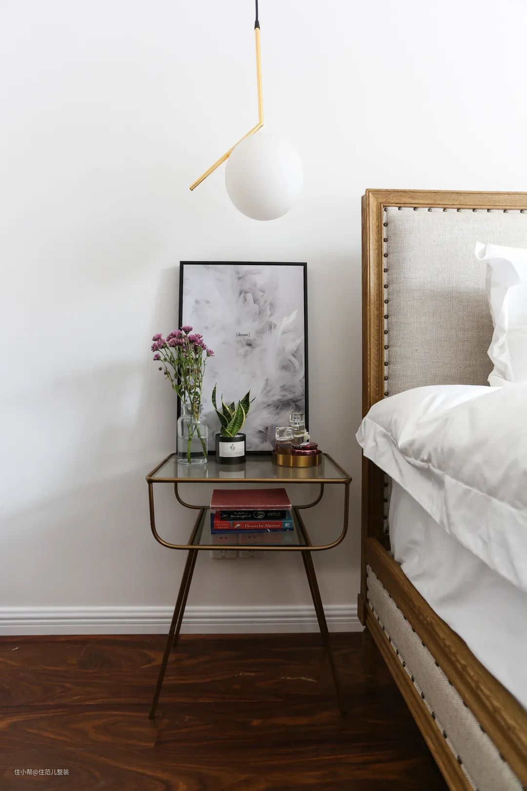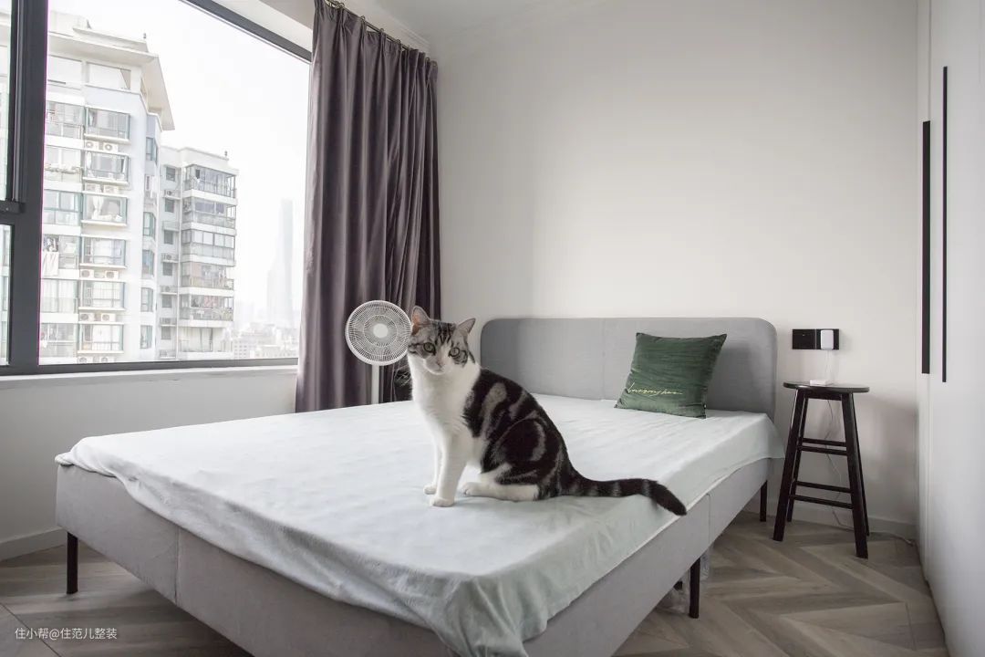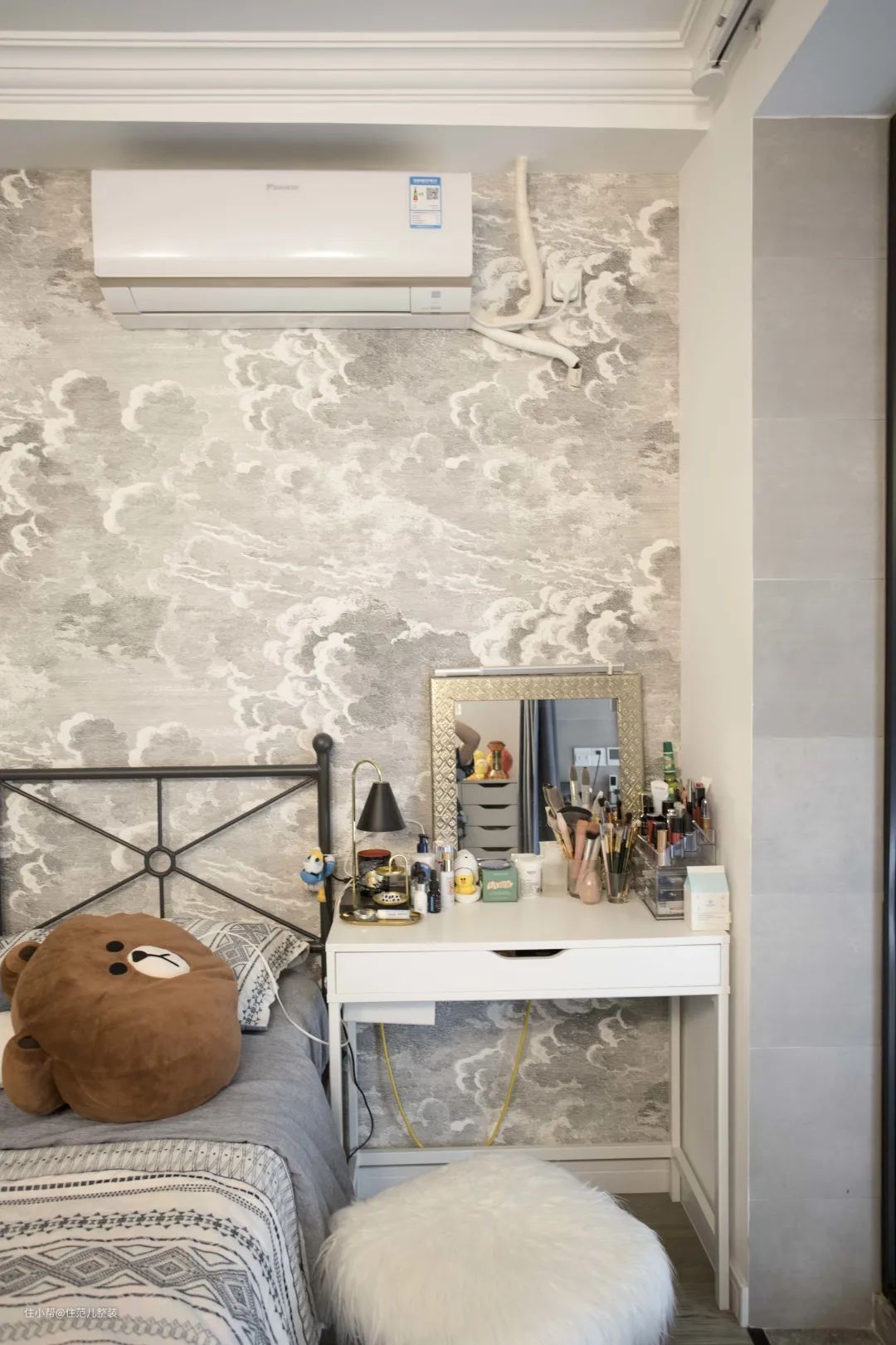 住范儿客户Julia家卧室,一侧的床头柜是宜家的小储物柜,另一侧的梳妆桌网上找了挺长时间,才找到原始原素这款长65cm,宽40的小巧梳妆桌。