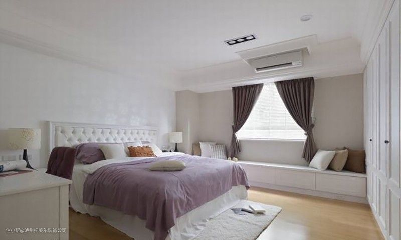 白色及美式风格延伸来到主卧房空间,在不动格局的考量下,设计师利用床尾衣柜及窗边平檯满足了收纳,拉出一进门的步伐景深。