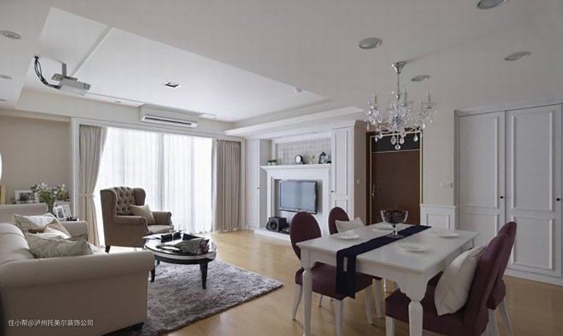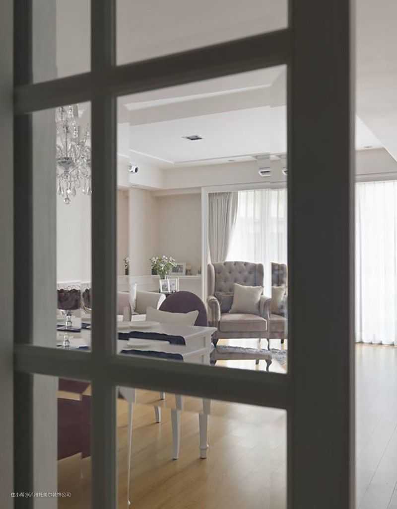 为了修饰社区中铝框的不协调,利用白色古典窗框佐以经典白纱与窗帘,完整客厅古典情调。