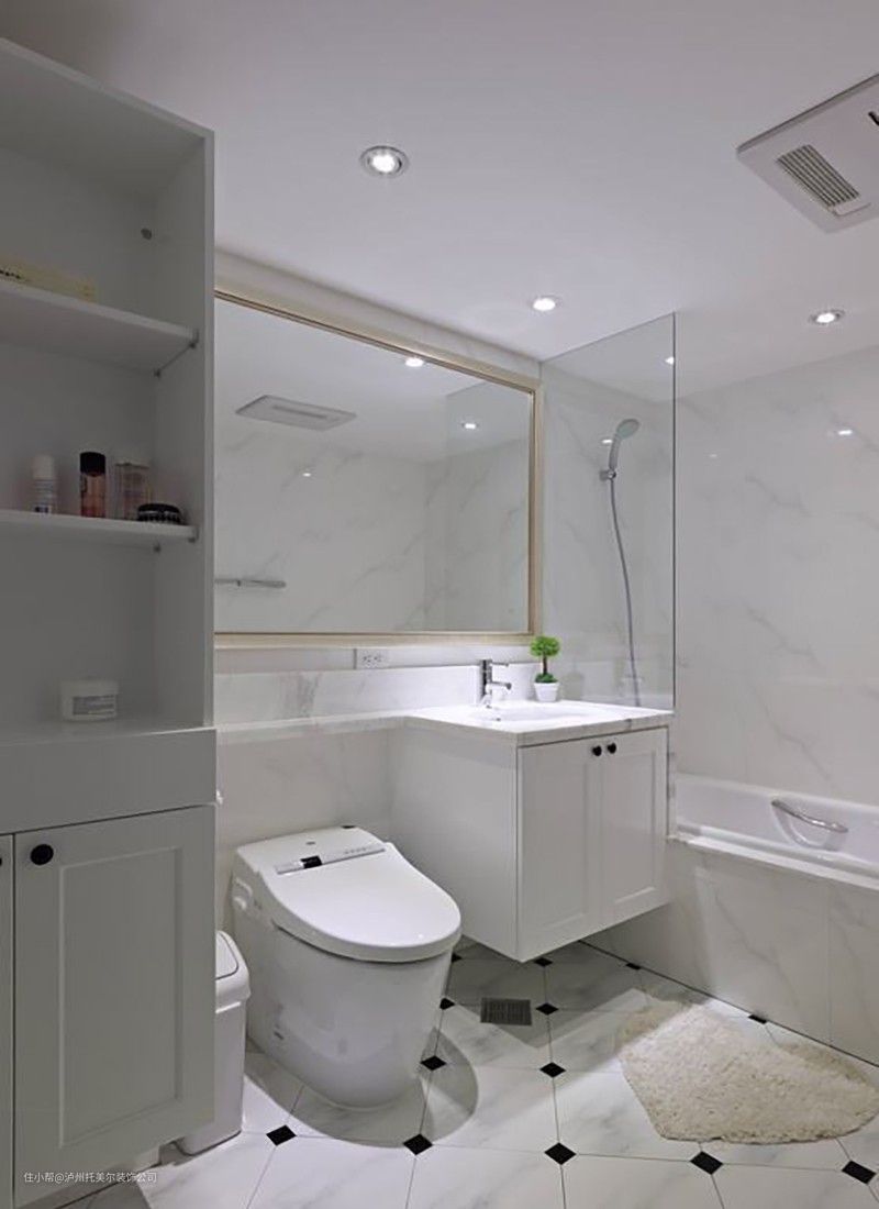 卫浴部份黑白磁砖交贴与不落地浴柜设计,连卫浴都有了美好比例。